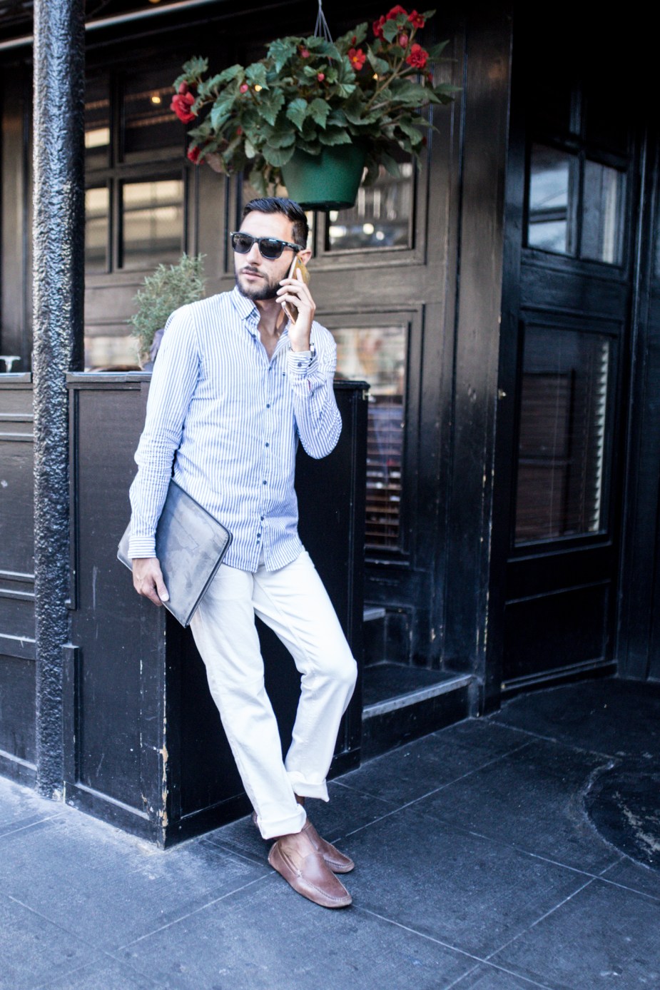Upscale Look – Striped long-sleeve button-down Zara gift from parents, White denim jeans Moschino (Similar by Kenneth Cole), Loafers 1501 from Nordstrom (Similar by G.H. Basse and Co. also from Nordstrom), Shades Ray-Ban, Cell phone case Roxxlyn