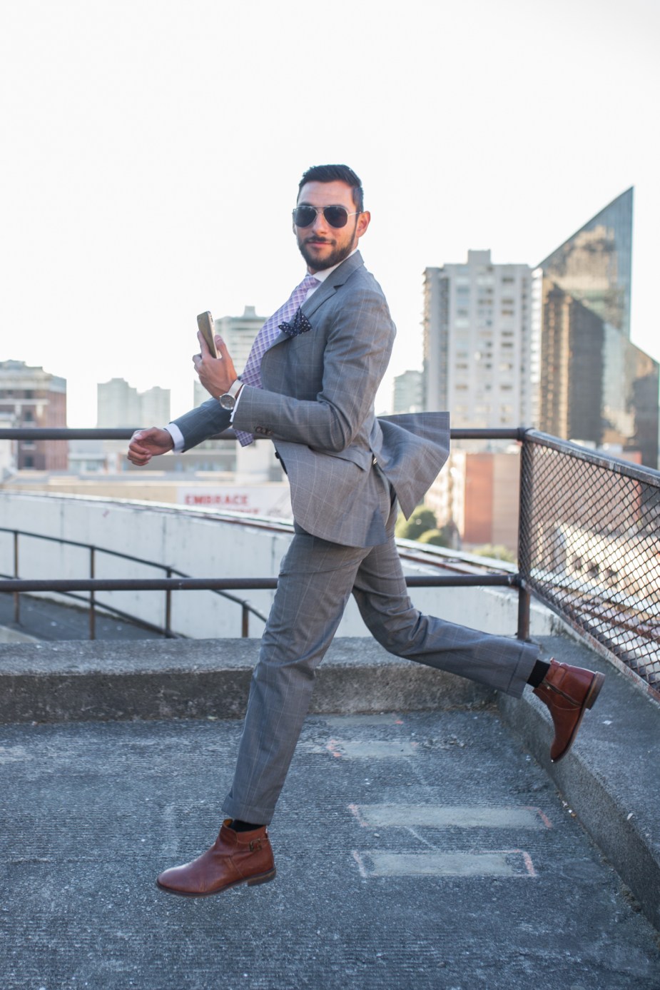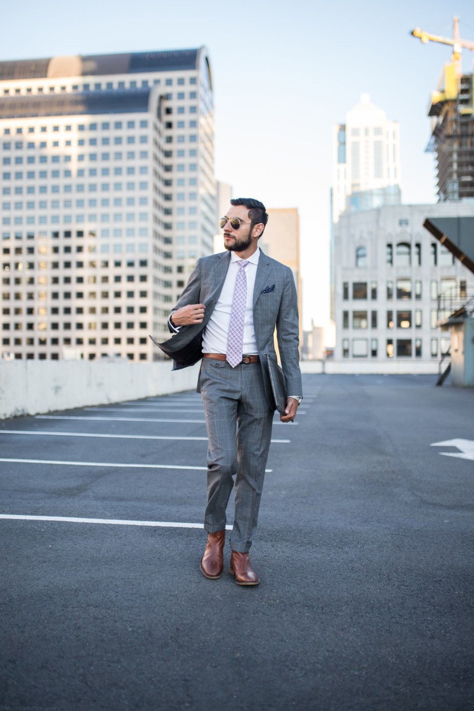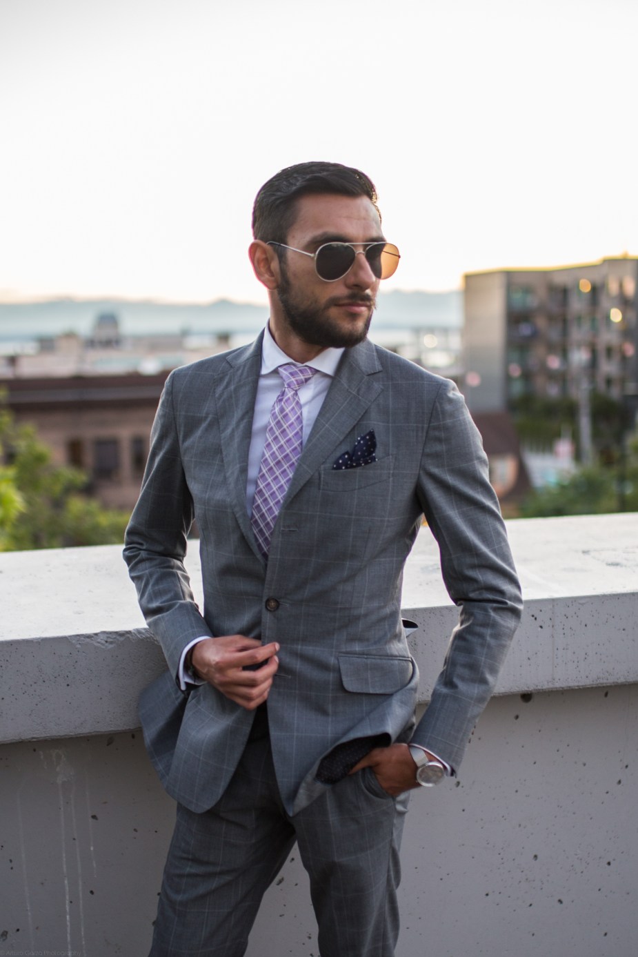 Dapper Look – Two-piece gray-patterned custom suit Beckett & Robb, White button-down Zara, Purple tie Hugo Boss (Similar also by Hugo Boss), Pocket square Club Monaco (Similar also by Club Monaco), Chelsea boots Aldo, Shades Burberry, Briefcase Roxxlyn