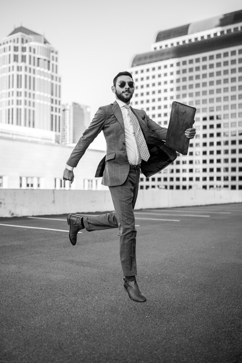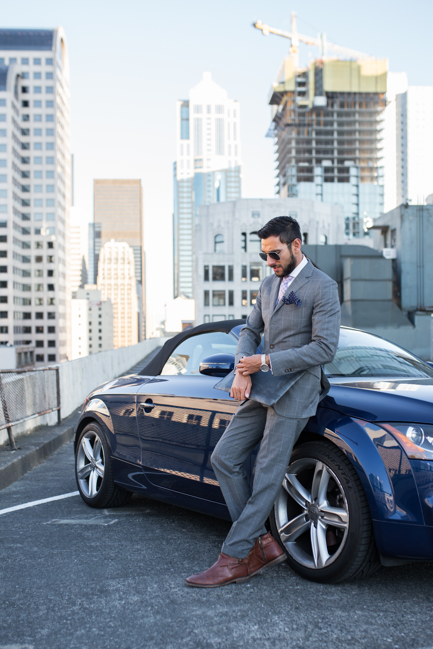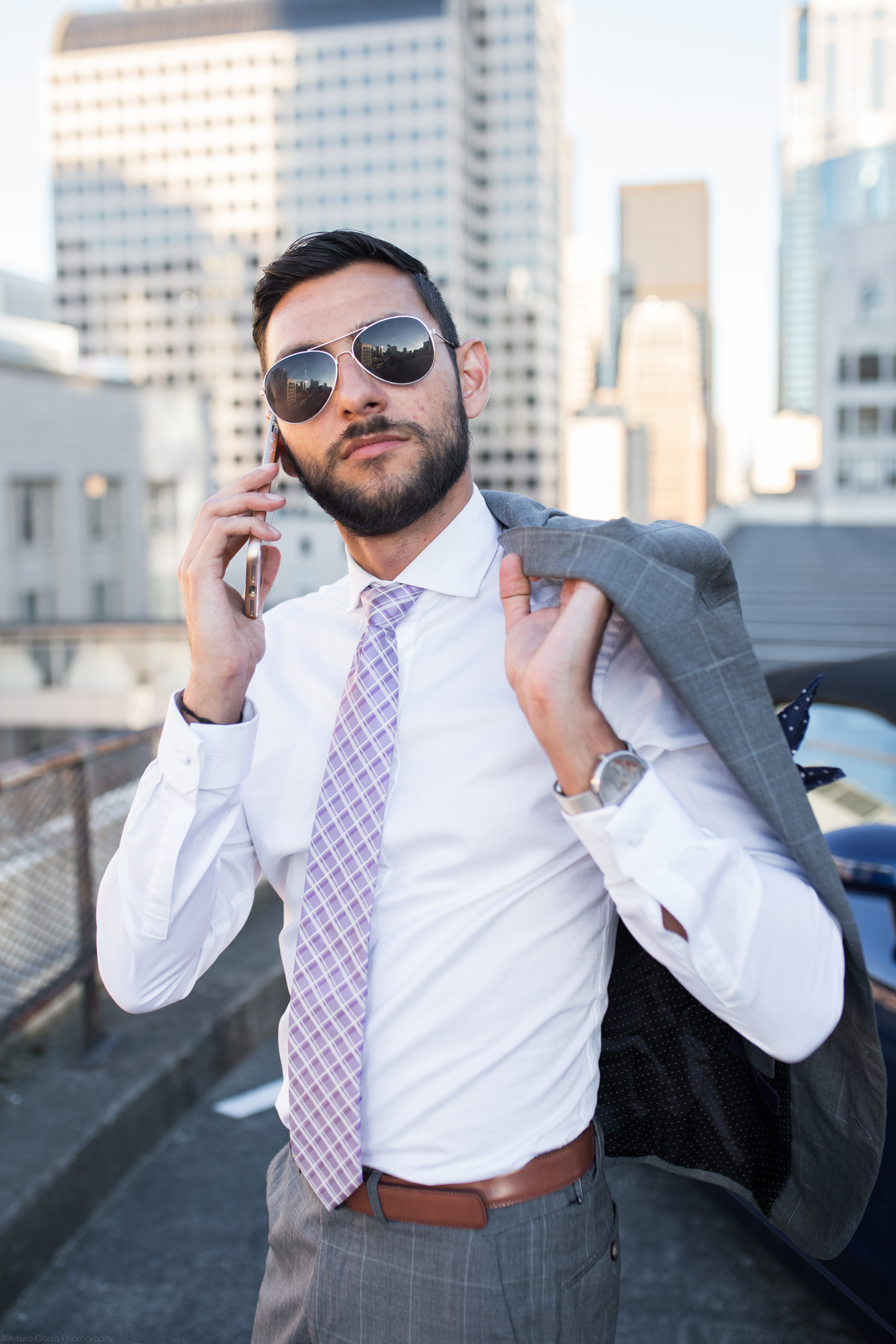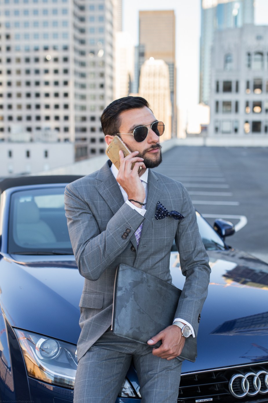 Dapper Look – Two-piece gray-patterned custom suit Beckett & Robb, White button-down Zara, Purple tie Hugo Boss (Similar also by Hugo Boss), Pocket square Club Monaco (Similar also by Club Monaco), Chelsea boots Aldo, Shades Burberry, Briefcase Roxxlyn