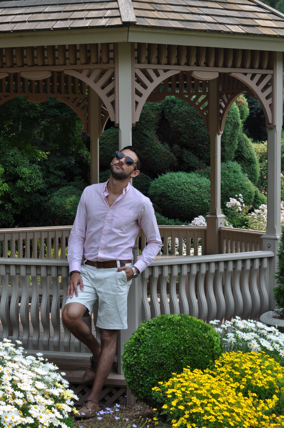 Rose button-down Club Monaco, White bermuda shorts Moschino (Similar by J. Crew), Leather belt Club Monaco, Brown dress shoes Aldo, Watch Roxxlyn, Shades Burberry