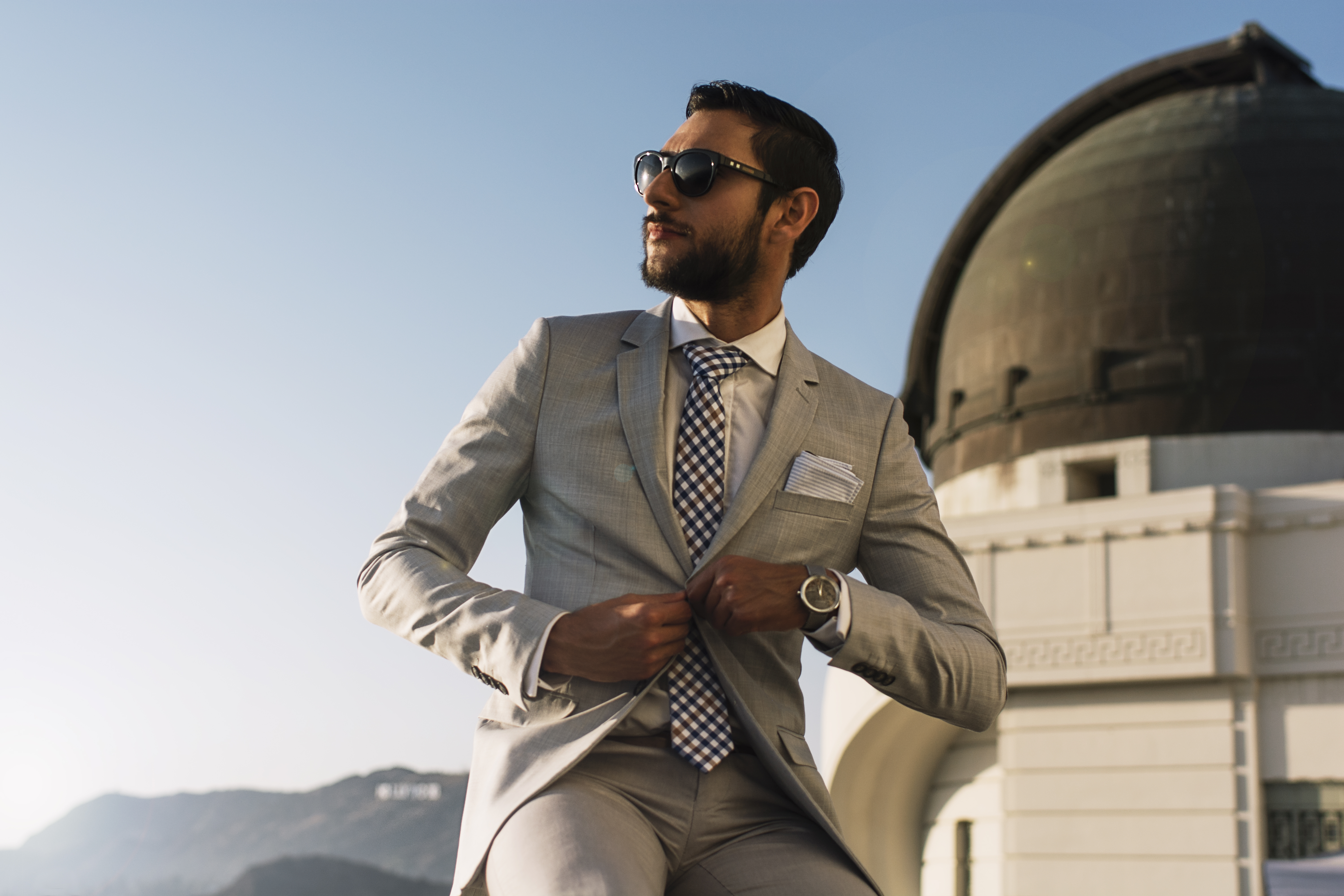 Para las fotografías en la ciudad donde siempre hay “un día más de sol” decidí vestir de forma neutra, un traje color gris matte que precisamente compré en Topman en esta misma ciudad. El color gris claro es uno de mis colores preferidos, ya que es muy fácil de subirlo o bajarlo de tono simplemente escogiendo una corbata distinta, u otra camisa, o inclusive un color diferente de zapato puede hacer el truco. Combiné este traje con una corbata de cuadritos de Tommy Hilfiger y un pañuelo rayado de J. Crew. Fíjense en cómo pude hacer que el look se viera un poco menos formal al vestirme con un cinto y zapatos color café, de Salvatore Ferragamo y Topman respectivamente y, completé el atuendo con mis lentes de sol Burberry. En general creo que el esquema de colores se vio increíble en los bellos e iluminados pasillos del observatorio, y creo que le rinde un buen homenaje a la Ciudad de las Estrellas. También quisiera agradecer y felicitar a Nick en grande por haber hecho este asombroso photoshoot conmigo y por traducir todos mis sentimientos sobre esta ciudad en estas fotografías. ¡Parece que salieron de una película!