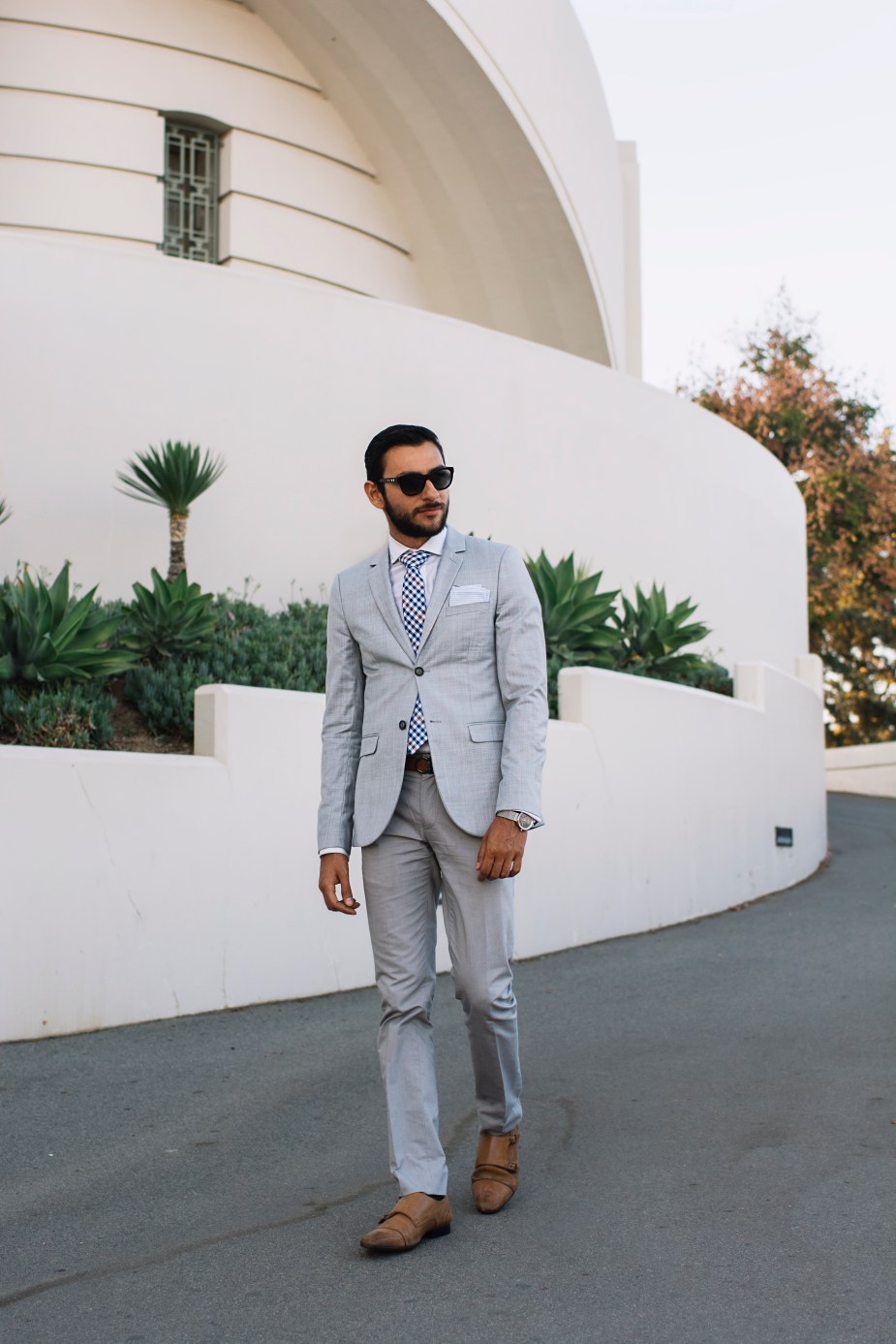 For my shoot in the city where there’s always “another day of sun” I decided to wear a very neutral, matte gray suit from Topman that I had bought precisely in this same city. Light gray is one of my favorite colors, because it’s so easy to tone it up or tone it down; just choosing a different tie, or a different shirt, or even a different shoe color might make the whole deal. I paired this with a checkered gingham tie from Tommy Hilfiger, and a striped pocket square from J. Crew. Notice how I down-scaled the look a bit by wearing a brown belt and tan monk shoes, from Salvatore Ferragamo and Topman respectively, and I topped the look with my Burberry shades. Overall I think the color schema looked amazing in the beautiful, light corridors of the observatory, and I think the outfit pays a really good homage to the City of Stars. I also want to thank Nick big time for doing this amazing photoshoot with me and for translating all of my feelings about this city in these photographs. They’re like out of the movies!