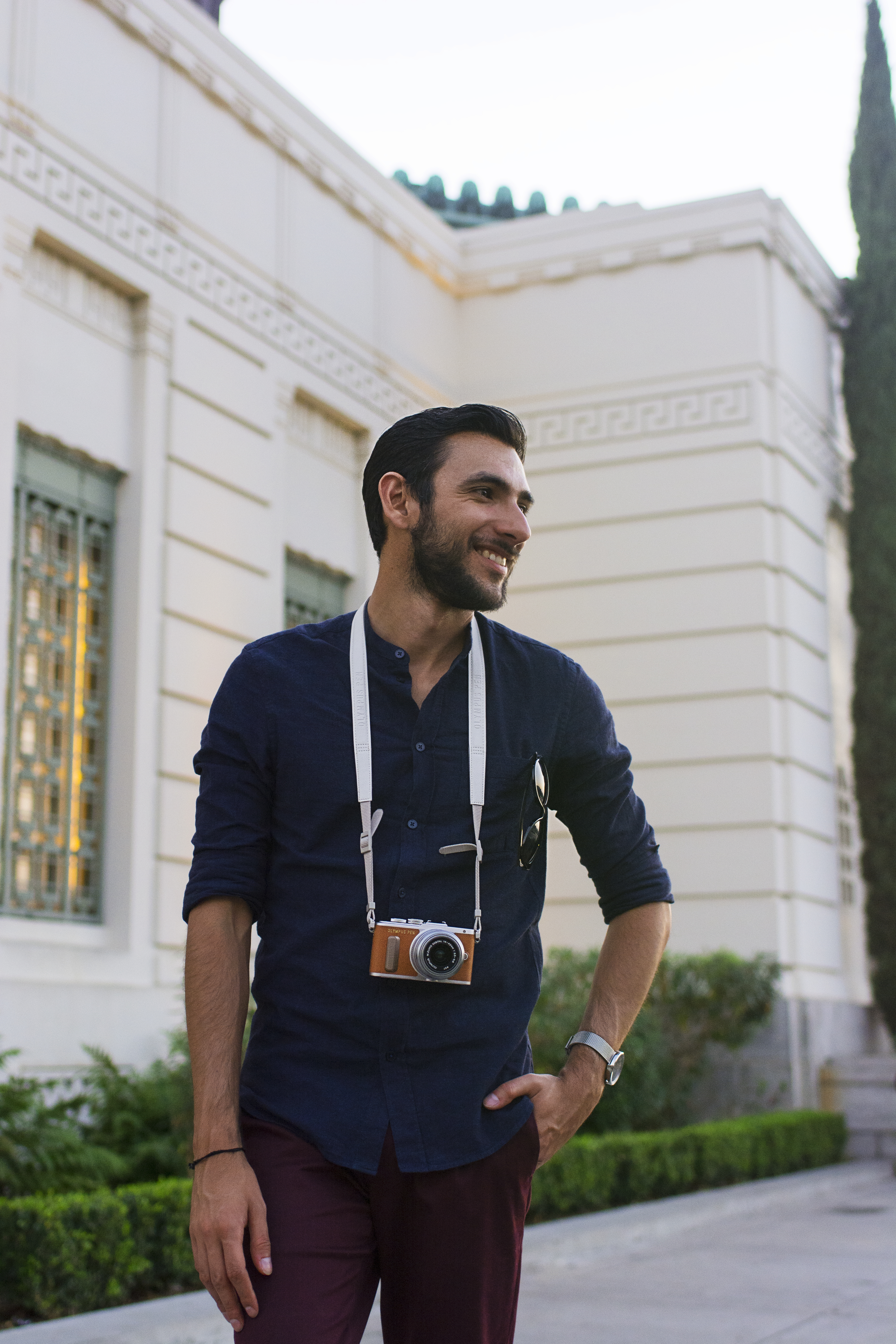 Para la sesión de fotos bañadas en luz del atardecer decidí vestir un look un poco más casual que comprende una camisa de botones sin cuello de H&M junto con mis pantalones chinos en color vino de Banana Republic. Con la influencia de las culturas asiáticas, las camisas sin collarín se están volviendo una moda muy popular esta temporada y, esta en particular viene en un color que es muy fácil de combinar con otros de mis colores favoritos de la temporada (como son el verde olivo y el café). El pantalón es muy relajado y cómodo, así que funciona de manera perfecta para cualquier situación al exterior. Para los accesorios, estoy portando mi cámara Olympus Pen, con la que logré capturar muy buenas fotos del atardecer, y mis lentes Burberry. Finalmente, un par de tenis Nike en color azul rey completan el look y le dan una vibra un poco más deportiva. ¿Qué opinan al respecto? Incluí algunas fotos en blanco y negro ya que se ven un poco más artísticas, y quisiera agradecer una vez más a Nick por haber tomado estas imágenes increíbles. Me la pasé muy bien contigo haciendo estas últimas dos sesiones de fotos y no puedo esperar por volver a trabajar contigo en un futuro.