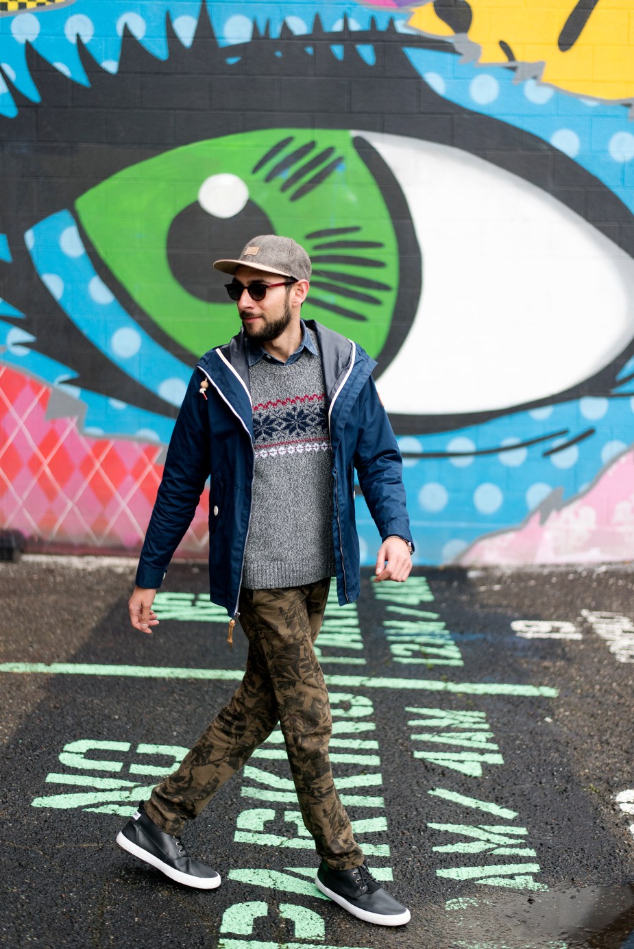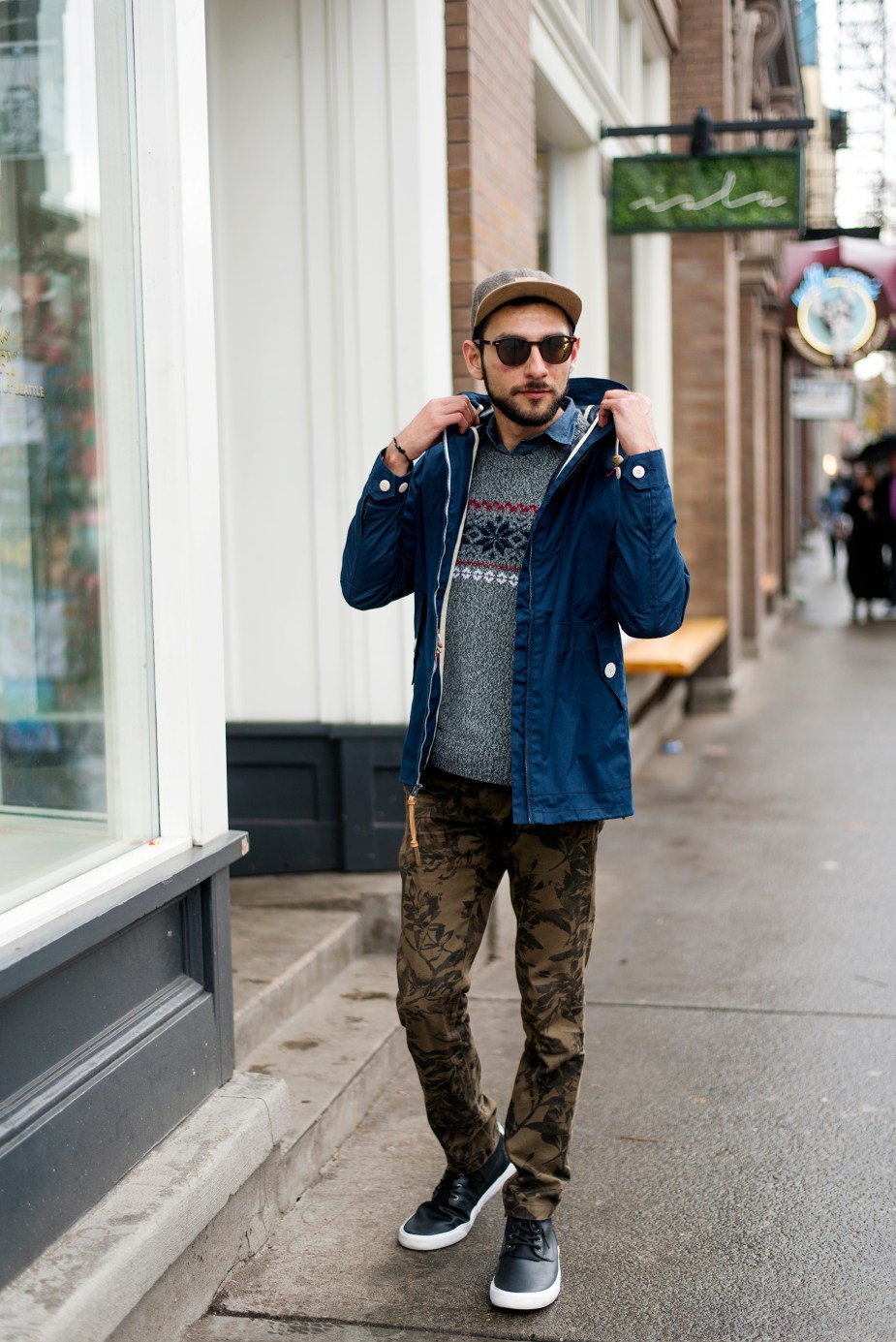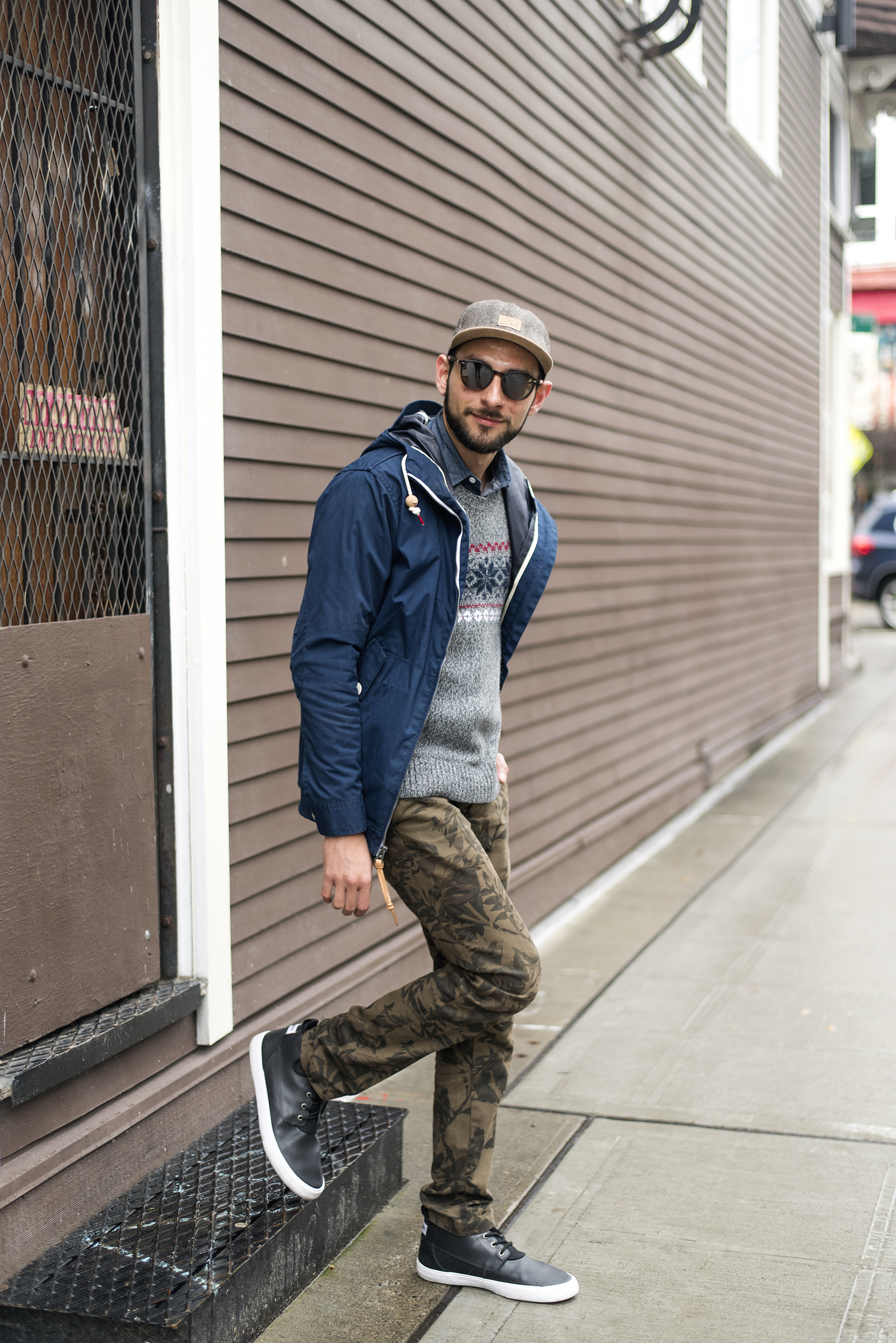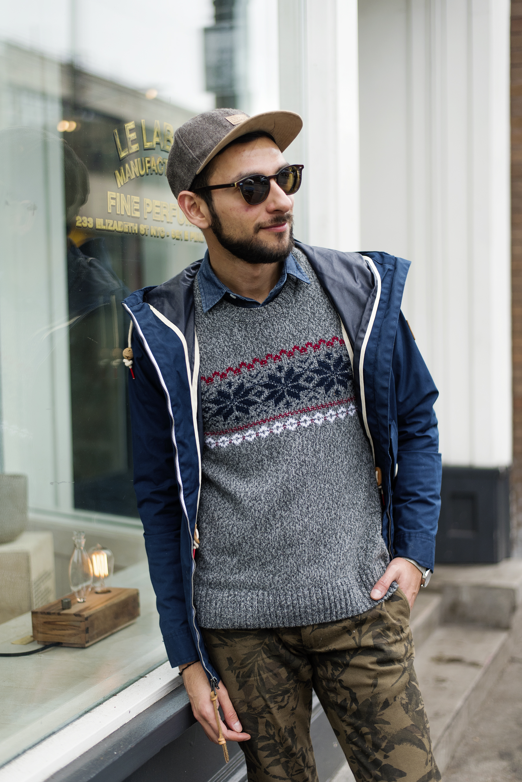 Street-style look – Raincoat Penfield (Similar also by Penfield), Christmas sweater Abercrombie & Fitch (Similar also by Abercrombie & Fitch), Denim shirt J. Crew, Camouflage pants Club Monaco (Similar by Camouflage AR and J), Hat H&M, Cutwater chukka boots Sperry Topsider, Ruby red sunnies Ollie Quinn, Black-and-horn prescribed glasses Ollie Quinn