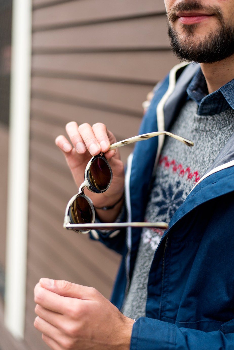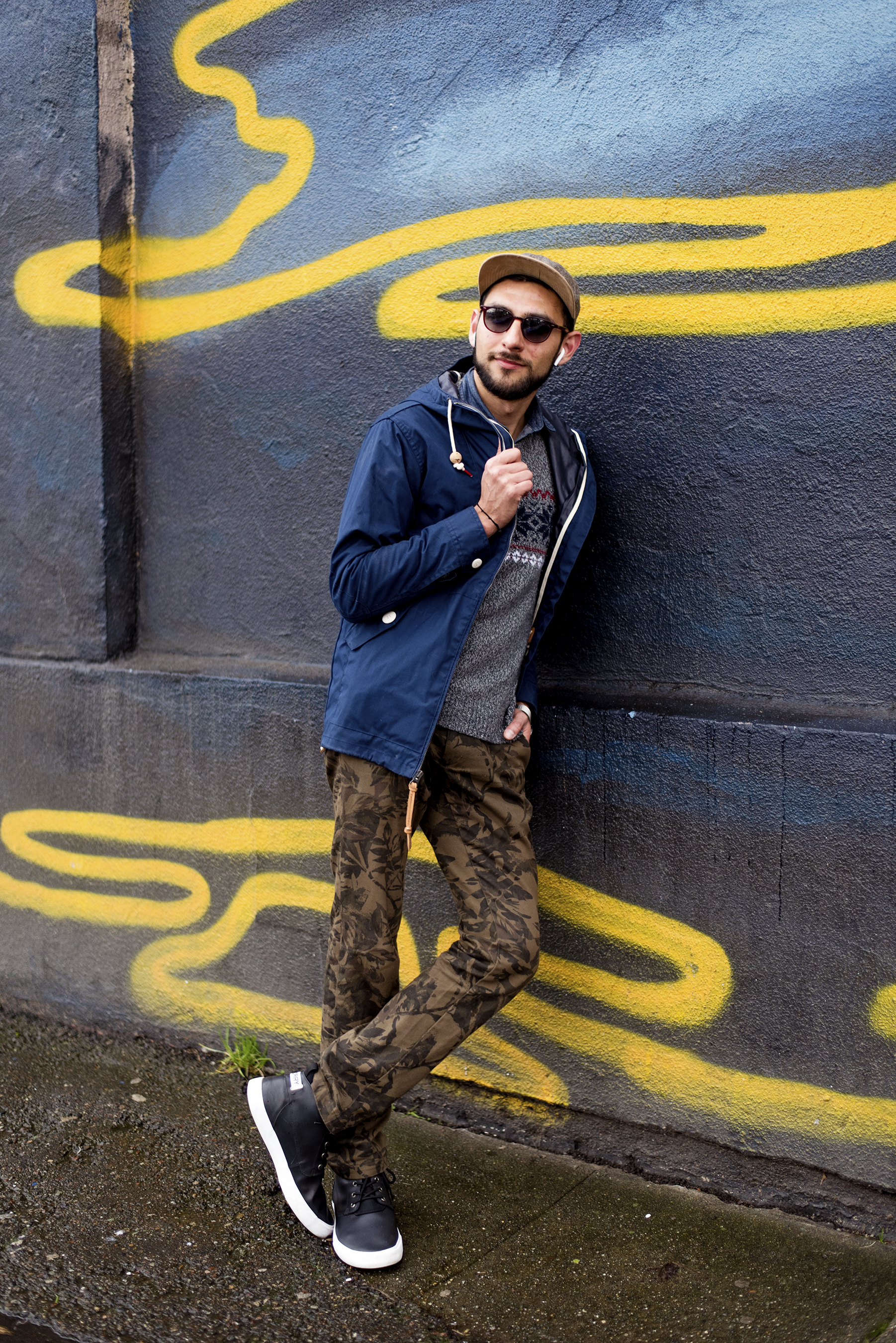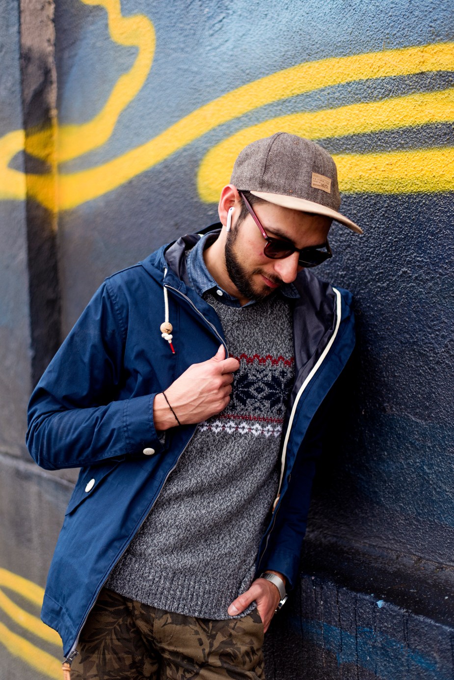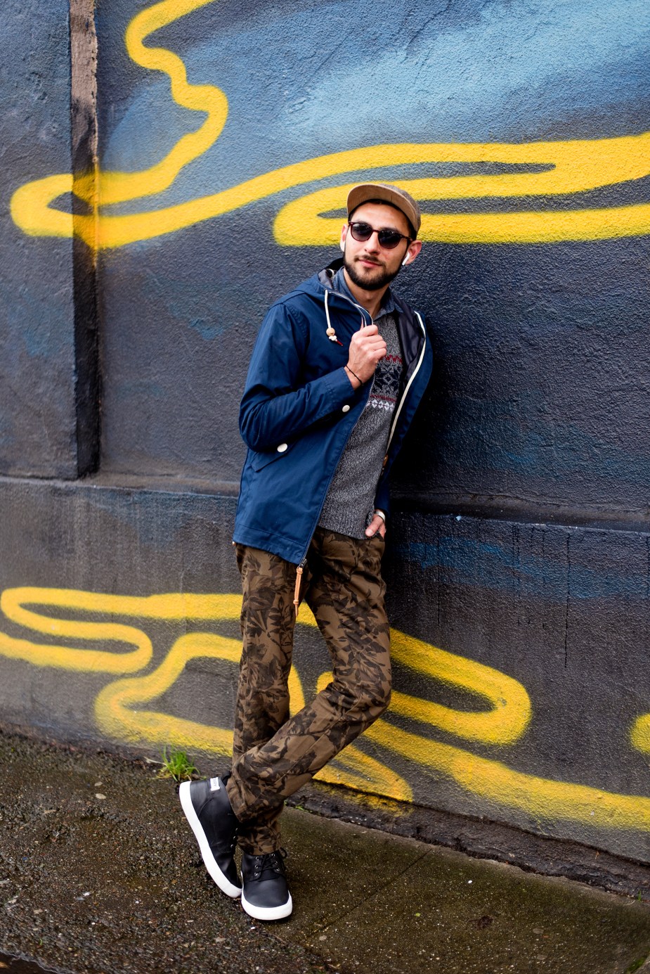 Street-style look – Raincoat Penfield (Similar also by Penfield), Christmas sweater Abercrombie & Fitch (Similar also by Abercrombie & Fitch), Denim shirt J. Crew, Camouflage pants Club Monaco (Similar by Camouflage AR and J), Hat H&M, Cutwater chukka boots Sperry Topsider, Ruby red sunnies Ollie Quinn, Black-and-horn prescribed glasses Ollie Quinn
