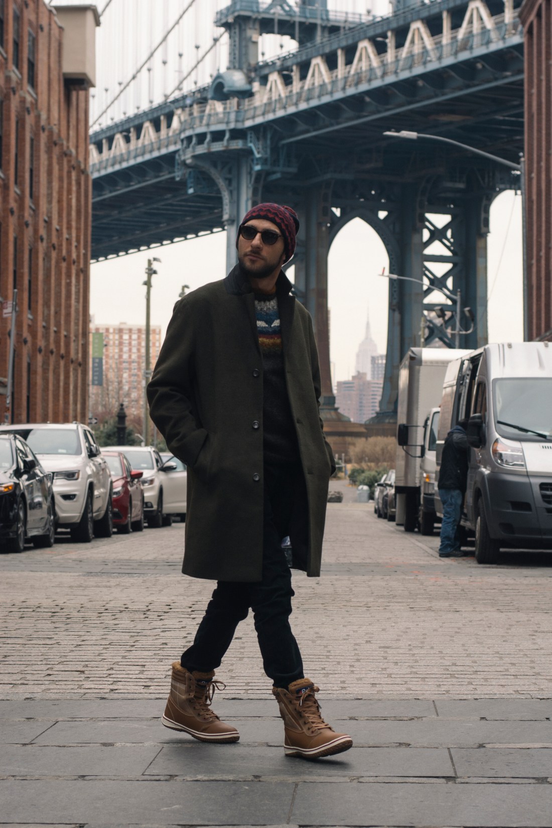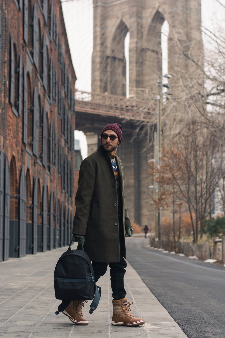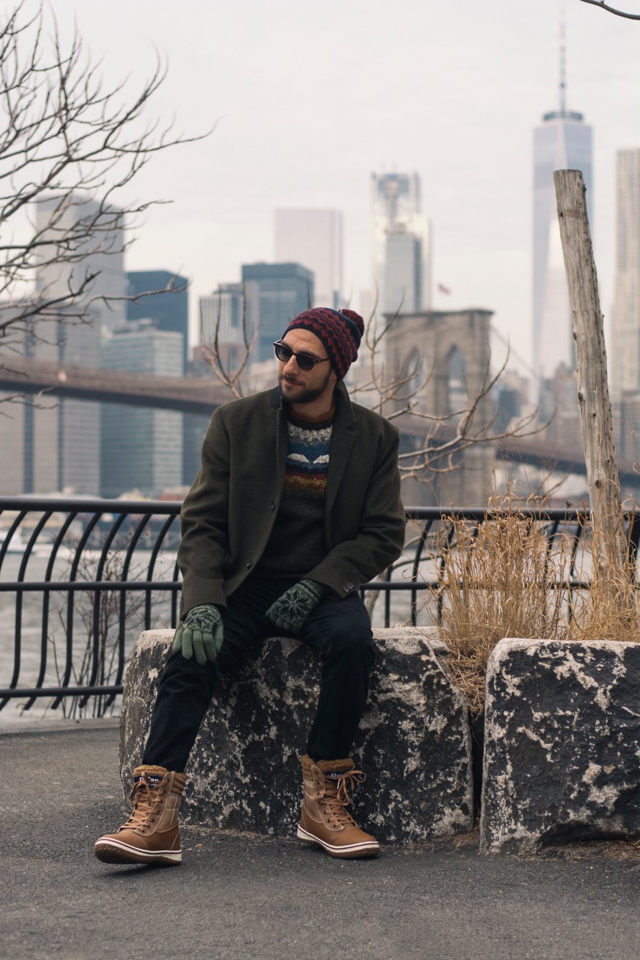 Now I’m going to shift gears a little bit, because if there’s one thing that cannot be missing in a NYFW post, is to of course, have a photo session in the beautiful city of NYC, and that’s how my Day 2 started. I embarked myself towards Brooklyn, that up-and-coming, bougie neighborhood which has become a beacon of creativity and artistry, and met with one of my favorite photographers, Nick Pierce, from Nick Pierce Photography. You might remember Nick from my LA photoshoot, which we were lucky to both be there at the same time during that trip. Well Nick lives in Brooklyn, and I met up with him to shoot at one of the most famous locations in NYC: Dumbo. Dumbo is a generic term for calling the area in the Hudson Bay right by the Williamsburg Bridge, and it has become an icon of this neighborhood in this side of town. For my shoot with Nick, I wanted to funnel a complete, Scandinavian look, just of the likes of what you would expect from Stockholm or Oslo in full Fair Isle style. I wore an authentic Icelandic wool sweater that I bought while in Iceland this past winter, along with a knit hat also from Iceland, and a pair of knit gloves. I paired these with my corduroy black pants from Club Monaco and I topped the look with an olive green oversized topcoat from Topman. For the shoes, I went for these pair of really warm winter boots from a Canadian company called Pajar, which was probably the best decision I ever made because it was below-freezing that morning, and with the wind blowing the real-feel temperature was probably in the teens. For the glasses I was wearing my Ollie Quinn ruby red frames, which were my favorite from my collaboration with them last time (by the way, the discount is about to expire, so if you haven’t placed an order you’re still in time to do so!)