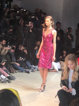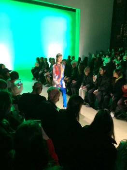 Right after the Tadashi event, the next runway show that I had tickets for was Adam Selman, which is actually the one that I had applied for when I was asked to create my schedule for the day. Selman is an acclaimed freelance designer, and had worked with Zaldy to produce custom looks for world tours of celebrities such as Michael Jackson, Lady Gaga, Britney Spears, and RuPaul, and he was also co-designer for Rihanna’s first clothing collection. So when he launched his personal line, ADAM SELMAN, in 2013 the world was in for a spin in his world of color and texture. This show featured a green runway, which made it feel like you were in the jungle at some points, but it was also so sensorial and animalistic, in the way the different animal prints were walking down the runway in beautifully made sweatshirts and body suits that it really captivated me. I think this was my favorite show, because not only was it visually appealing, but the whole experience of the show was something I had never lived before.