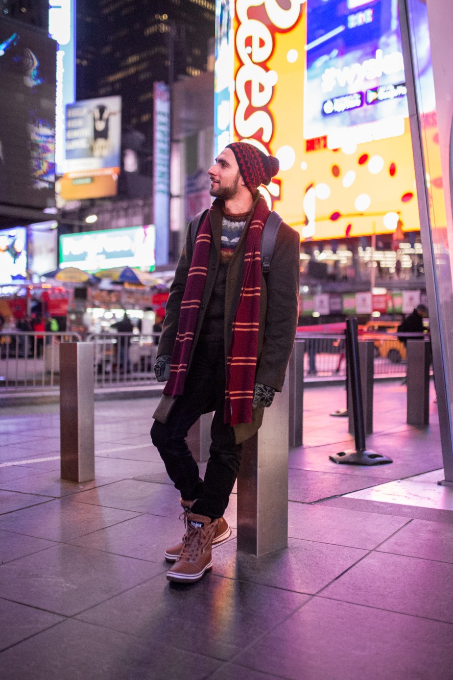 Day 2 look – Olive green topcoat Topman (Similar by Tommy Hilfiger), Fair Isle knit wool sweater Original from Iceland (Similar by Brooks Brothers), Black corduroy pants Club Monaco, Fair Isle knit hat Original from Iceland (Similar by Vineyards Vines), Fair Isle knit gloves Original from Iceland (Similar on Asos), Scarf Original from Scotland (Similar by Brooks Brothers), Backpack Ted Baker, Winter boots Pajar, Shades Ollie Quinn, Smartwatch Skagen
