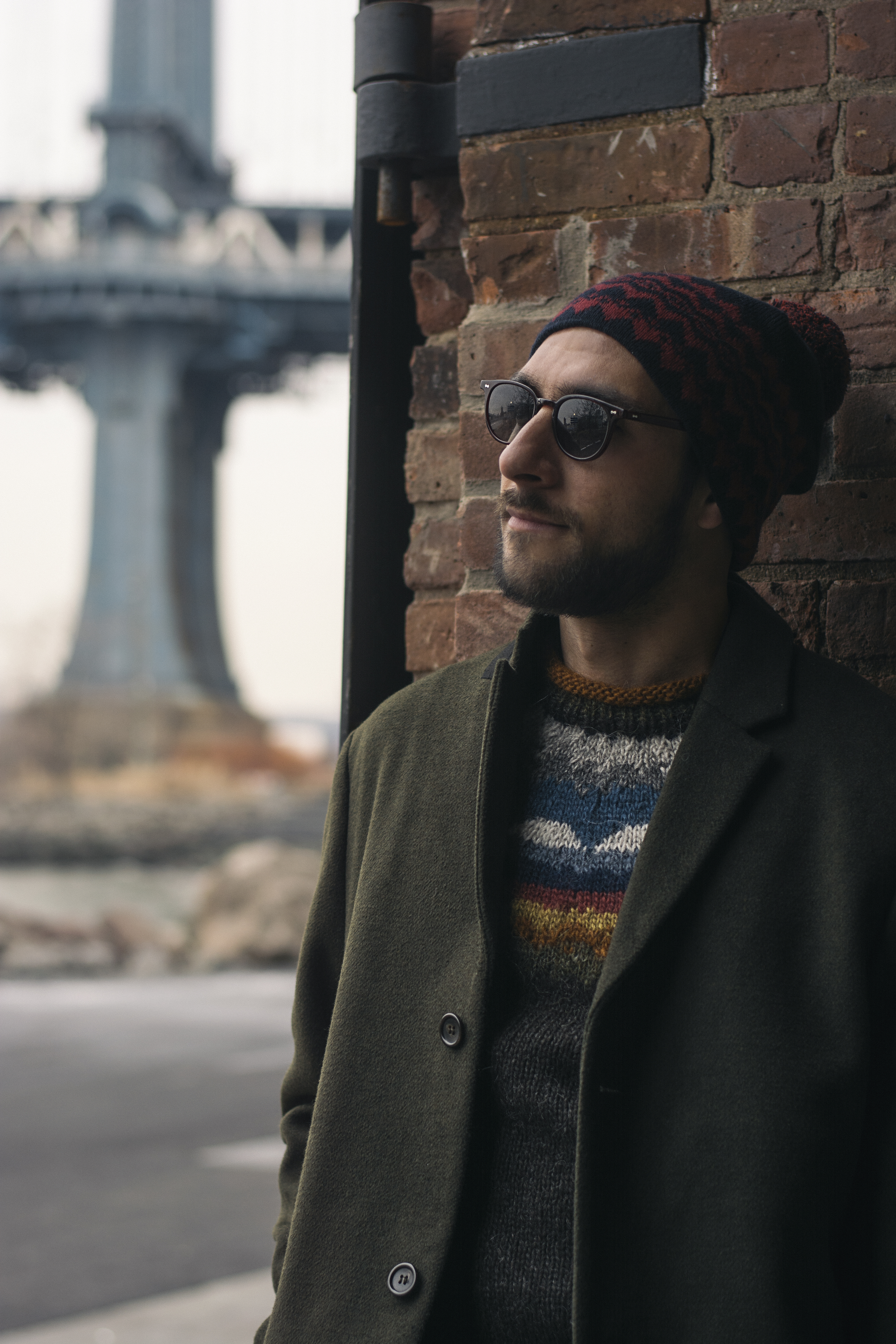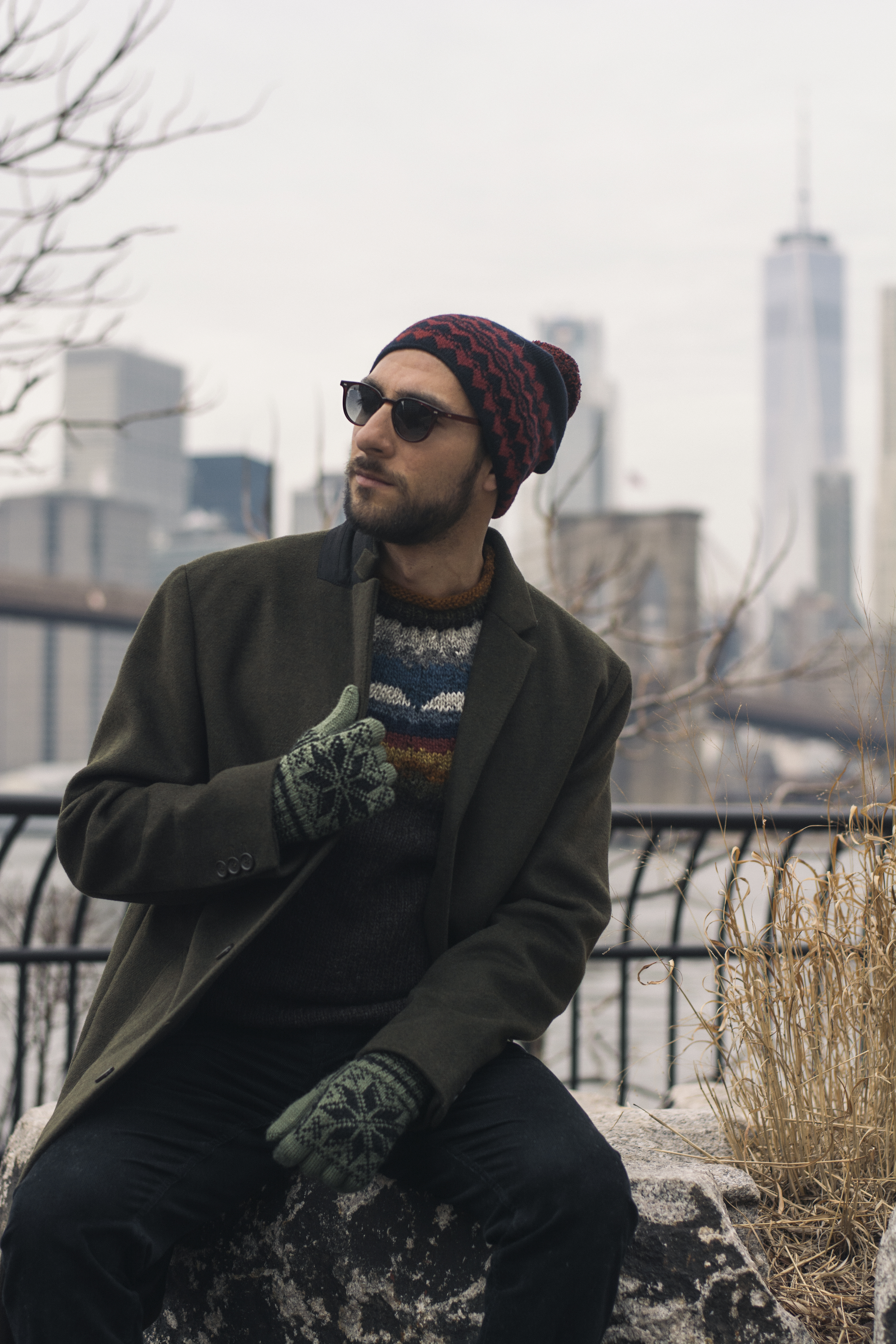 Now I’m going to shift gears a little bit, because if there’s one thing that cannot be missing in a NYFW post, is to of course, have a photo session in the beautiful city of NYC, and that’s how my Day 2 started. I embarked myself towards Brooklyn, that up-and-coming, bougie neighborhood which has become a beacon of creativity and artistry, and met with one of my favorite photographers, Nick Pierce, from Nick Pierce Photography. You might remember Nick from my LA photoshoot, which we were lucky to both be there at the same time during that trip. Well Nick lives in Brooklyn, and I met up with him to shoot at one of the most famous locations in NYC: Dumbo. Dumbo is a generic term for calling the area in the Hudson Bay right by the Williamsburg Bridge, and it has become an icon of this neighborhood in this side of town. For my shoot with Nick, I wanted to funnel a complete, Scandinavian look, just of the likes of what you would expect from Stockholm or Oslo in full Fair Isle style. I wore an authentic Icelandic wool sweater that I bought while in Iceland this past winter, along with a knit hat also from Iceland, and a pair of knit gloves. I paired these with my corduroy black pants from Club Monaco and I topped the look with an olive green oversized topcoat from Topman. For the shoes, I went for these pair of really warm winter boots from a Canadian company called Pajar, which was probably the best decision I ever made because it was below-freezing that morning, and with the wind blowing the real-feel temperature was probably in the teens. For the glasses I was wearing my Ollie Quinn ruby red frames, which were my favorite from my collaboration with them last time (by the way, the discount is about to expire, so if you haven’t placed an order you’re still in time to do so!)
