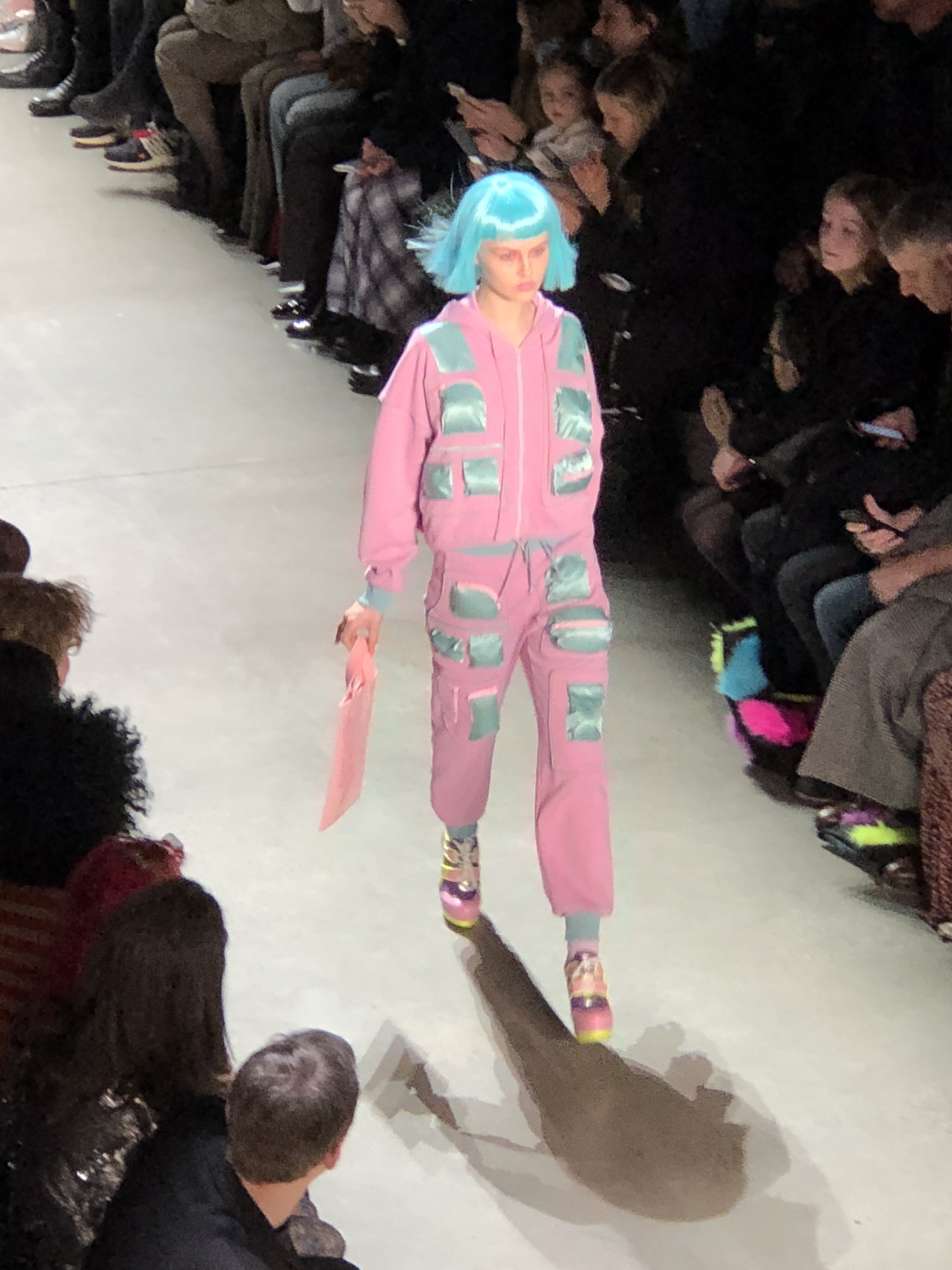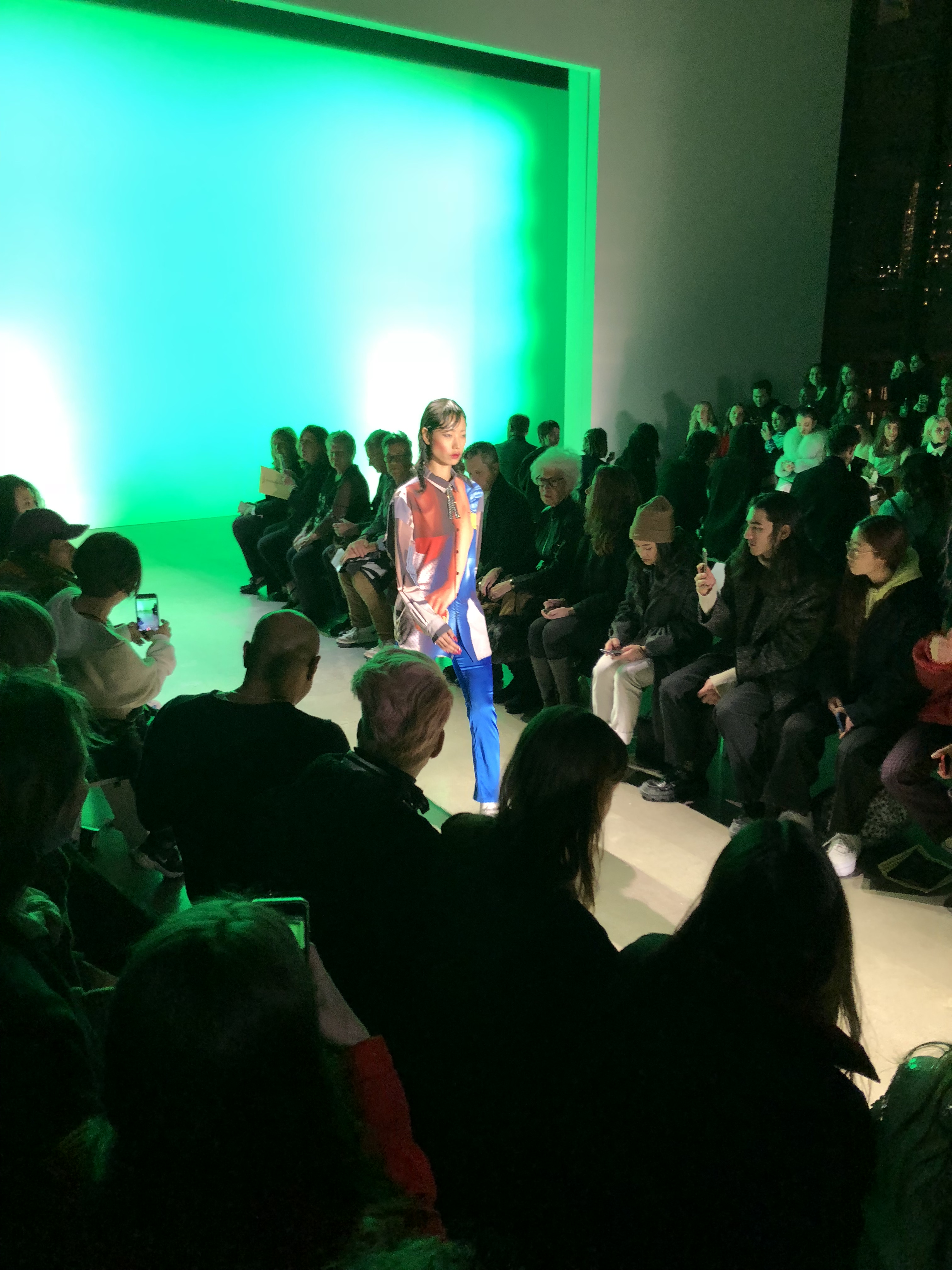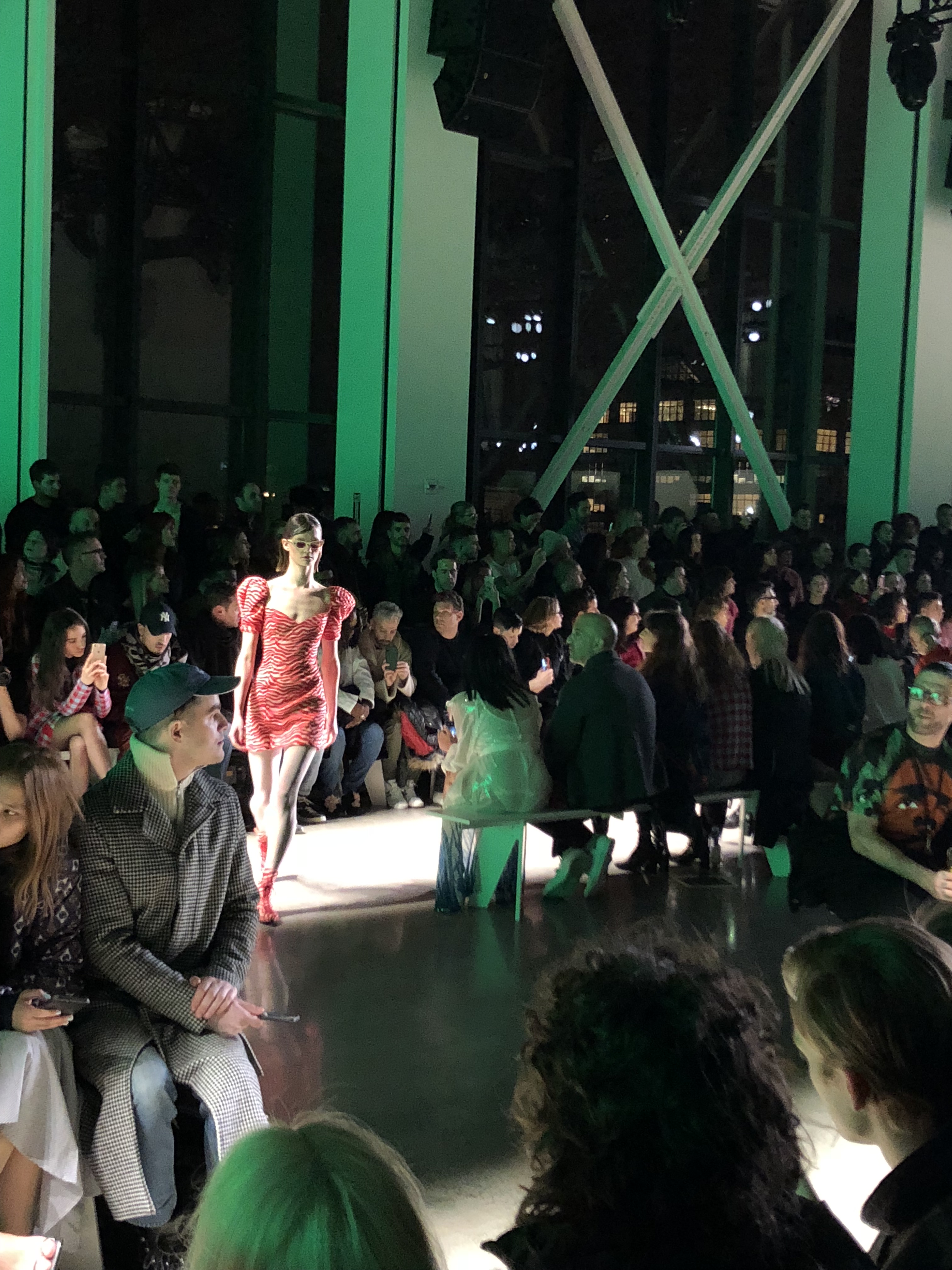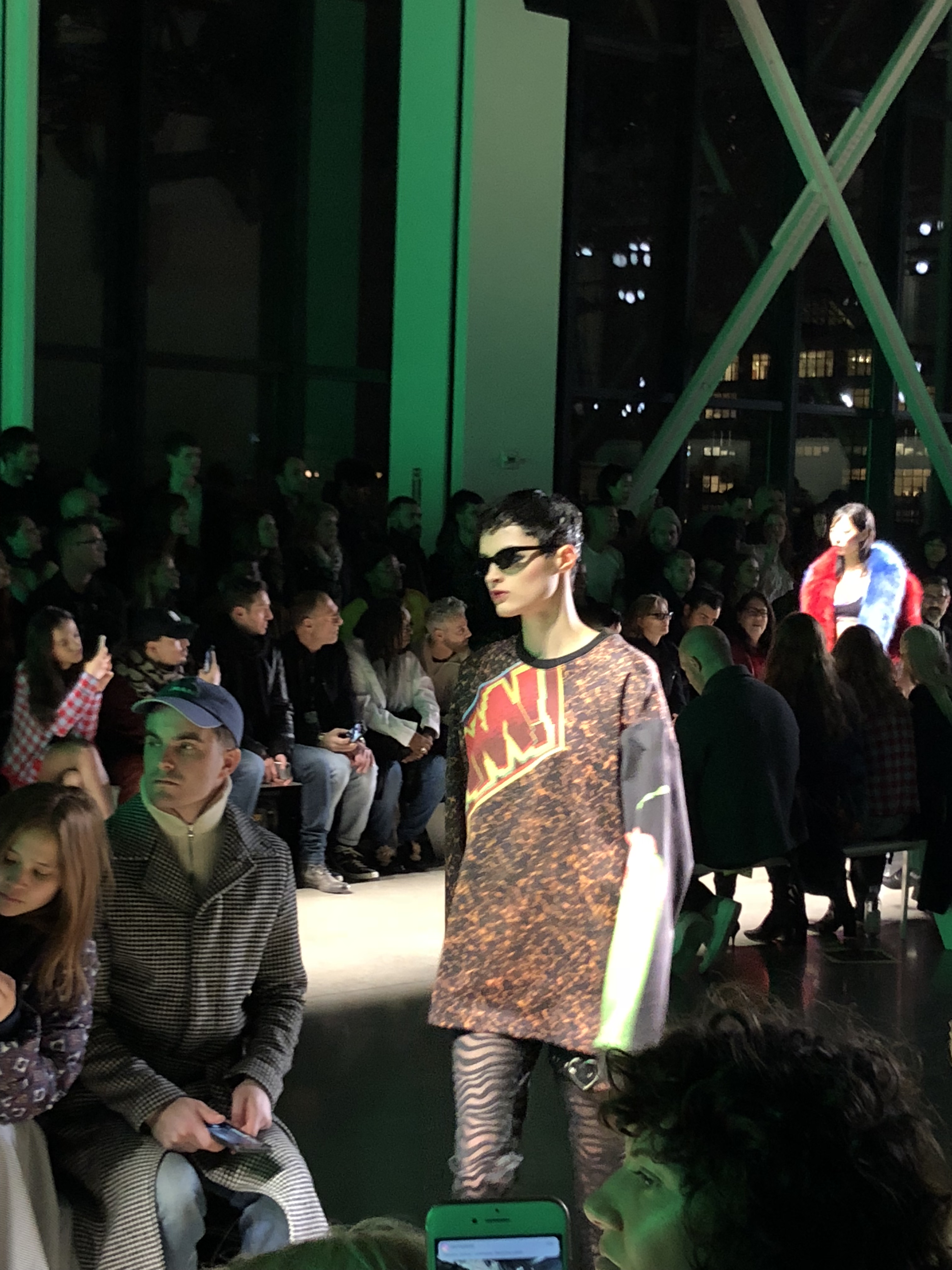 Right after the Tadashi event, the next runway show that I had tickets for was Adam Selman, which is actually the one that I had applied for when I was asked to create my schedule for the day. Selman is an acclaimed freelance designer, and had worked with Zaldy to produce custom looks for world tours of celebrities such as Michael Jackson, Lady Gaga, Britney Spears, and RuPaul, and he was also co-designer for Rihanna’s first clothing collection. So when he launched his personal line, ADAM SELMAN, in 2013 the world was in for a spin in his world of color and texture. This show featured a green runway, which made it feel like you were in the jungle at some points, but it was also so sensorial and animalistic, in the way the different animal prints were walking down the runway in beautifully made sweatshirts and body suits that it really captivated me. I think this was my favorite show, because not only was it visually appealing, but the whole experience of the show was something I had never lived before.