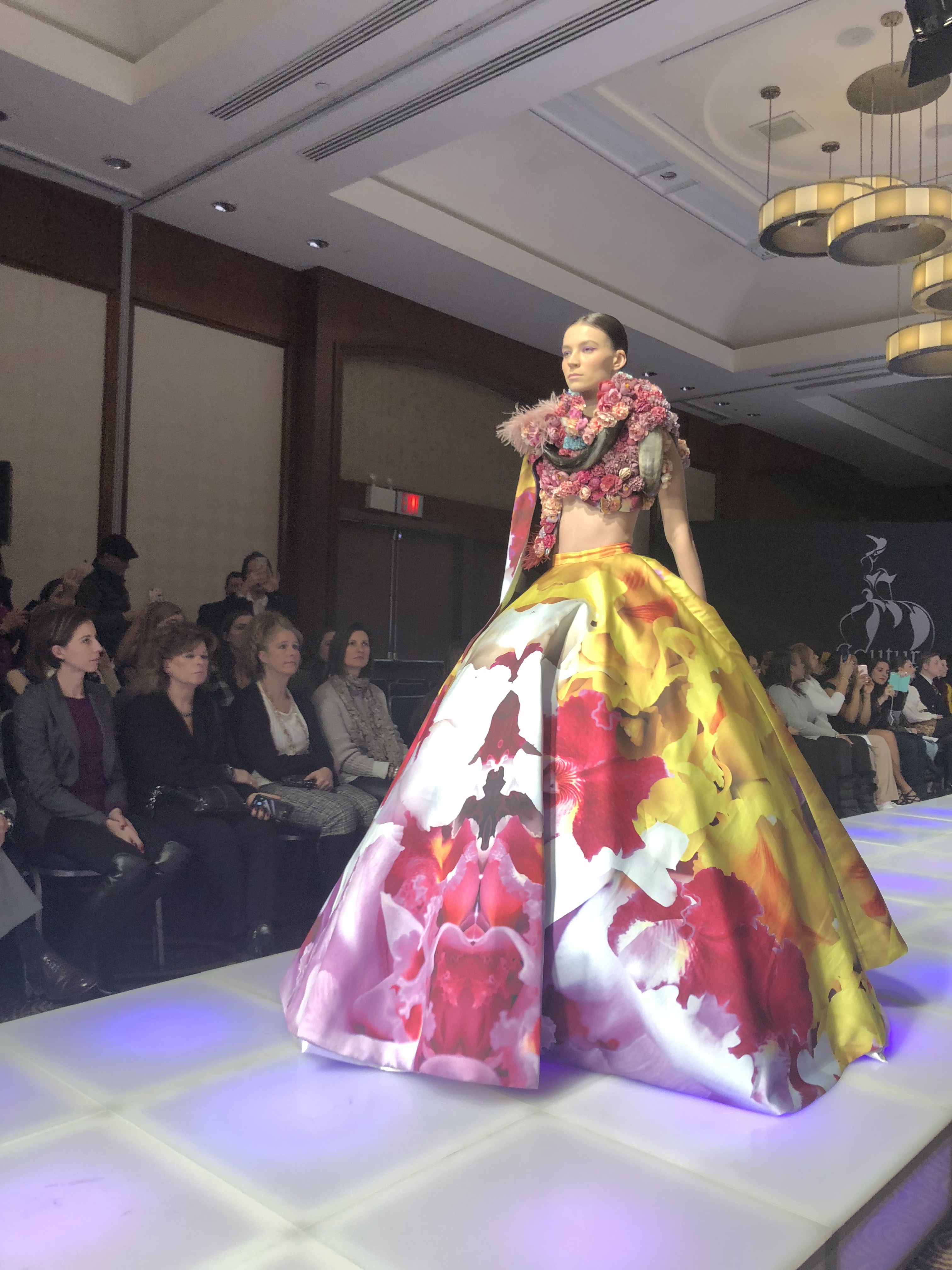 The first show that I was able to witness was COLOVOS, which is a brand that is inspired by women’s strength channeled through her vulnerability. You can see this juxtaposition between the flowy, maternal look, and the strength in the boldness of the fabric. I was able to meet and greet the designers right after the show, and I was really impressed to know this was the motivation behind the collection, because I did get a sense of both power and femininity in these clothes. However, what I was most surprised to know was that all the skins, furs, and leathers they were using were actually fake, and a lot of these materials were made out of recycled bottles from the ocean. This enhances their process to have an almost zero-footprint on the environment, which is something quite impressive. Overall I really liked this collection, and I think that this is going to become a trend in the world of fashion given that with climate change, pollution, and the focus on carbon-footprint, the fashion world needs to be in the forefront of producing sustainable materials.