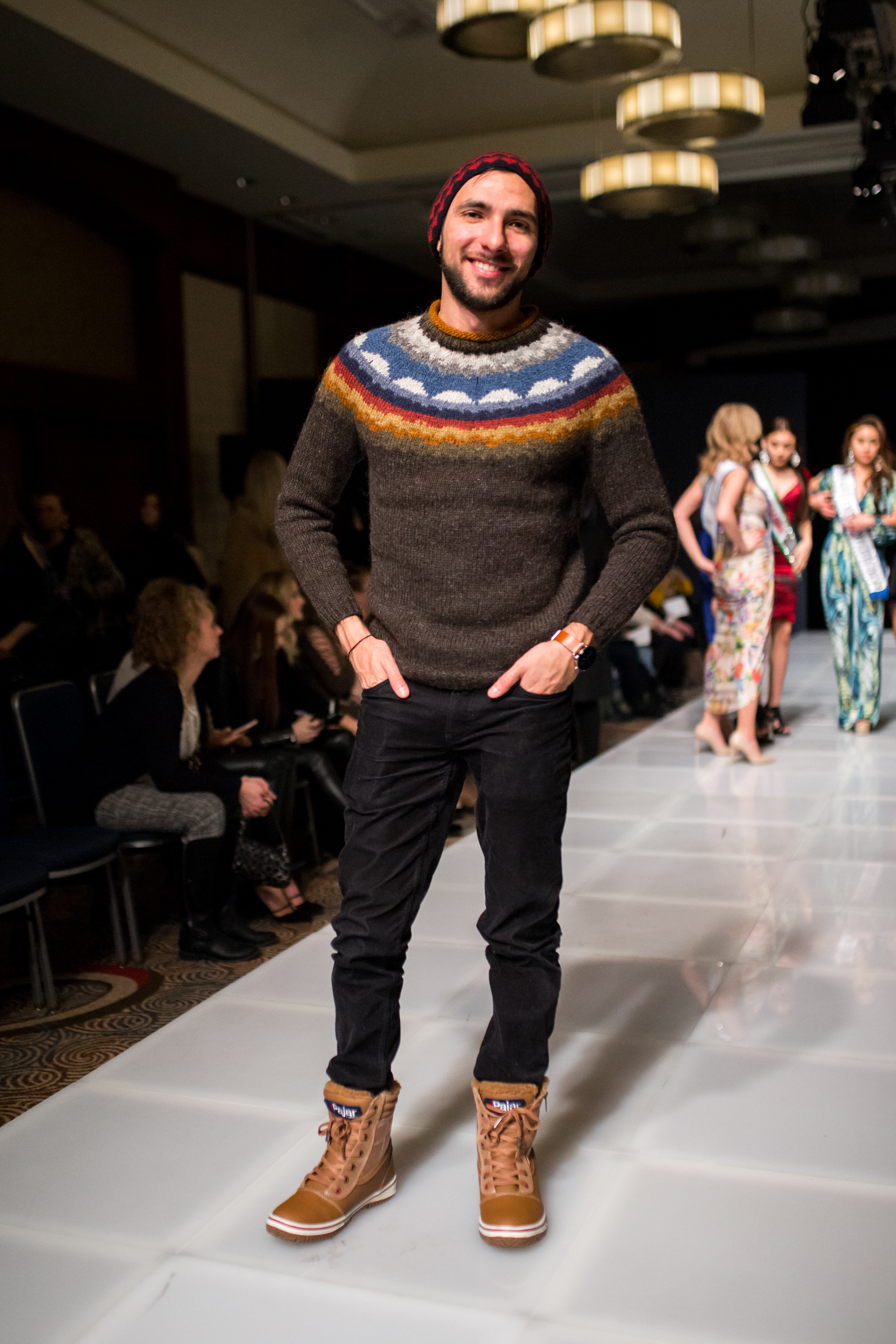 Day 2 look – Olive green topcoat Topman (Similar by Tommy Hilfiger), Fair Isle knit wool sweater Original from Iceland (Similar by Brooks Brothers), Black corduroy pants Club Monaco, Fair Isle knit hat Original from Iceland (Similar by Vineyards Vines), Fair Isle knit gloves Original from Iceland (Similar on Asos), Scarf Original from Scotland (Similar by Brooks Brothers), Backpack Ted Baker, Winter boots Pajar, Shades Ollie Quinn, Smartwatch Skagen