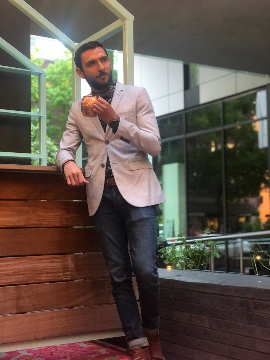 For this special evening, I decided to wear a full-on spring combination comprised of a gray blazer from Topman and a floral blue button-down from Club Monaco. I paired these two with my favorite jeans from Topman and completed the look with a baby blue bow tie, also from the same store (you can tell I like Topman right?) For the shoe, I went for a brown Chelsea boot from Aldo and my colorful, Fair Isle socks are from J. Crew. This was the perfect ensamble for the evening, since as the sun went down it actually turned from warm to cool, and I was able to enjoy the night by having one of my favorite drinks: a Moscow Mule. What do you guys think? Are you all ready to incorporate some of these tips in your spring fashion? I want to thank Antonio for taking the following photos and Avi and Endurance for organizing such a fun event.