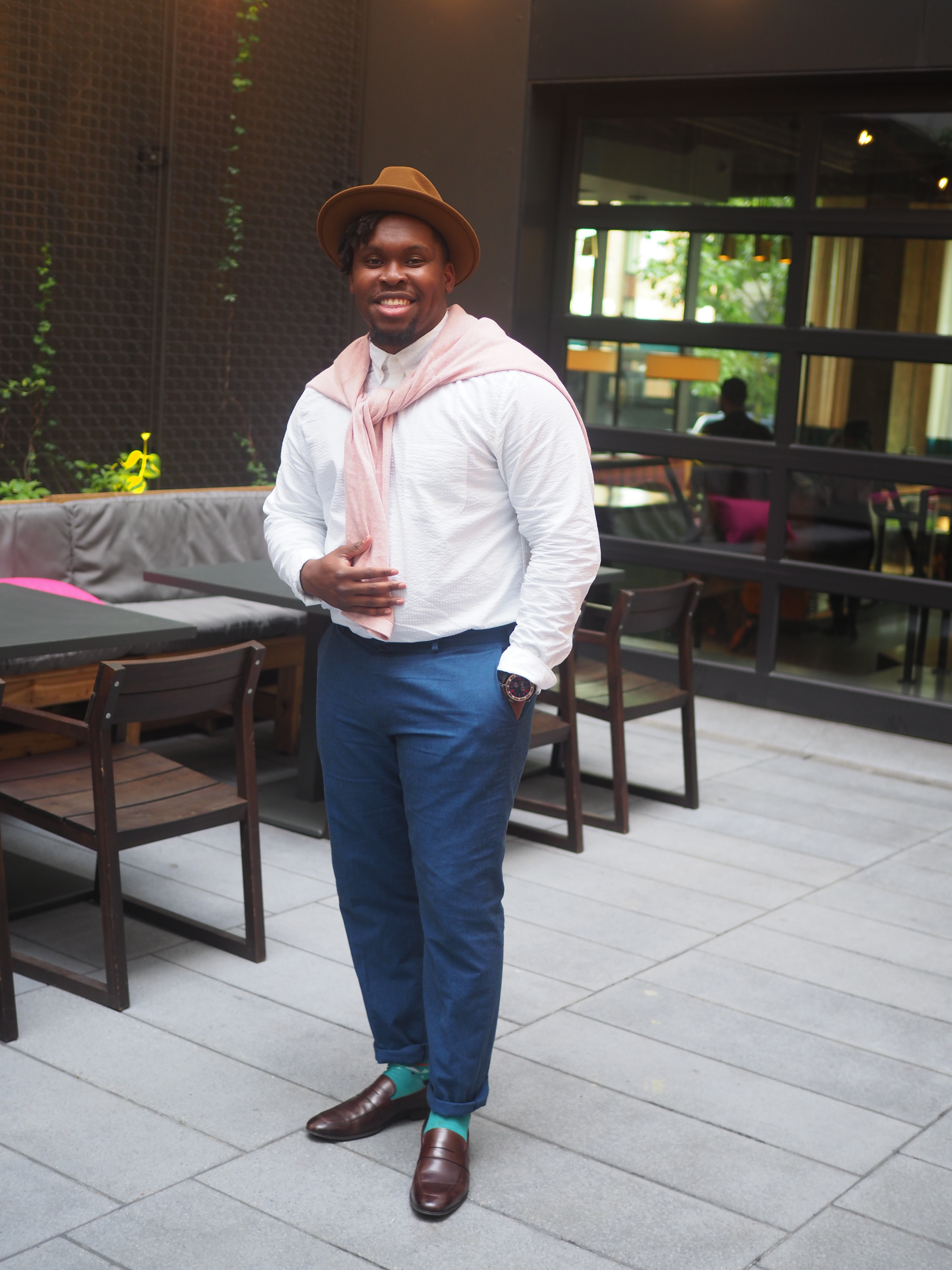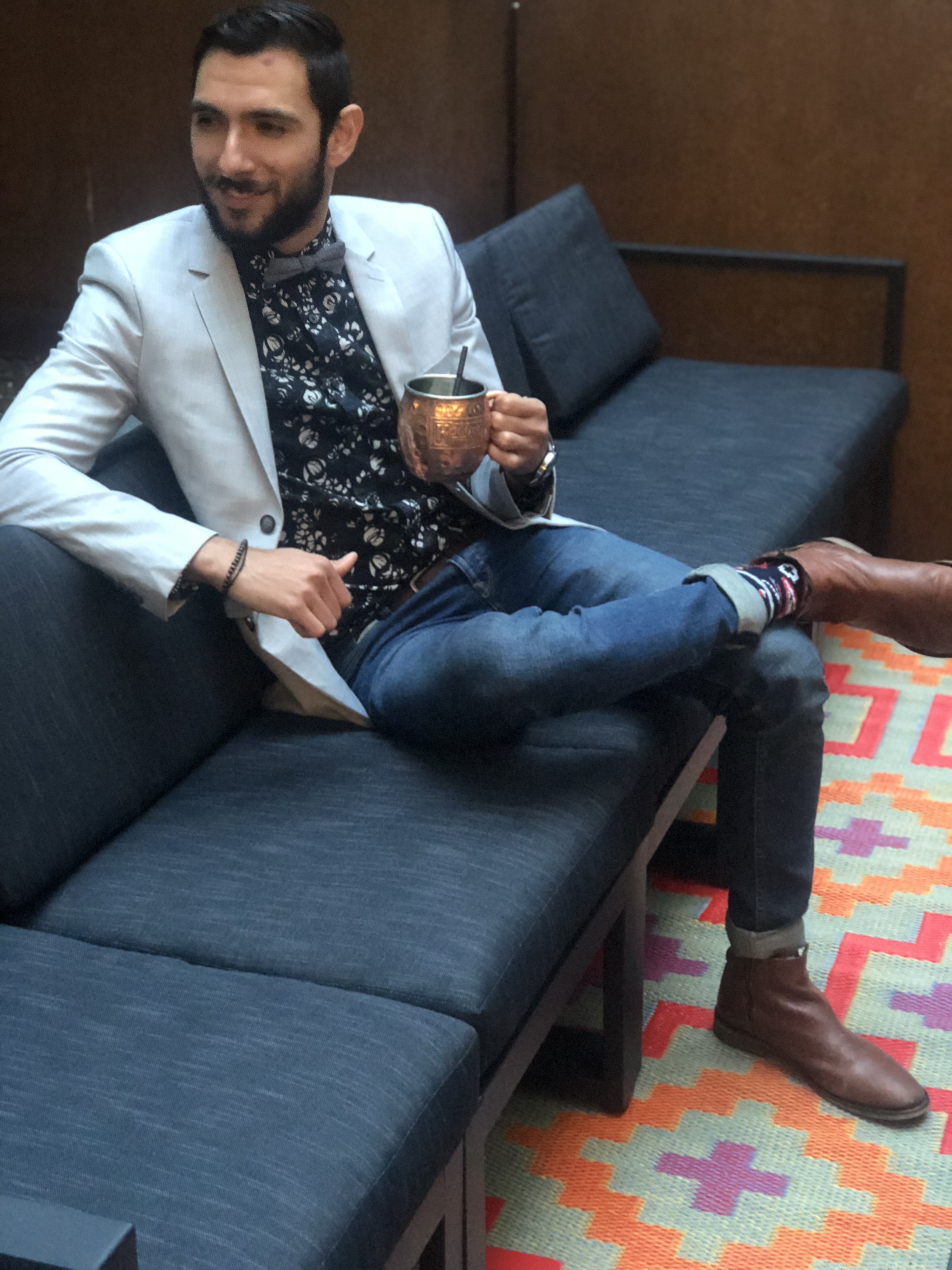 Para esta noche especial, decidí vestir una combinación completamente primaveral que consistía en un saco en color gris de Topman con una camisa de botones floral en color azul de Club Monaco. Me puse con estos mi par de jeans favoritos de Topman y completé el look con un moño en color azul cielo, también de la misma tienda (¿pueden decir que me gusta mucho Topman, verdad?) Para el calzado, opté por una bota estilo Chelsea en color café de Aldo y mis calcetines coloridos de las islas nórdicas de J. Crew. Este fue el atuendo ideal para la ocasión, ya que conforme bajaba el sol realmente se empezó a poner más fresco, y además pude disfrutar de la noche con una de mis bebidas favoritas: un Moscow Mule. ¿Qué opinan amigos? ¿Están listos para incorporar algunos de estos consejos en su moda de primavera? Quisiera agradecerle a Antonio por tomar estas fotos y a Avi y Endurance por organizar un evento tan divertido.