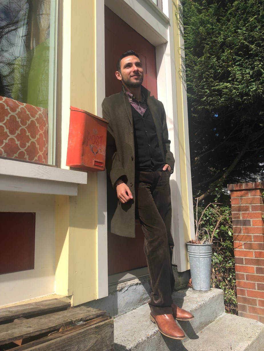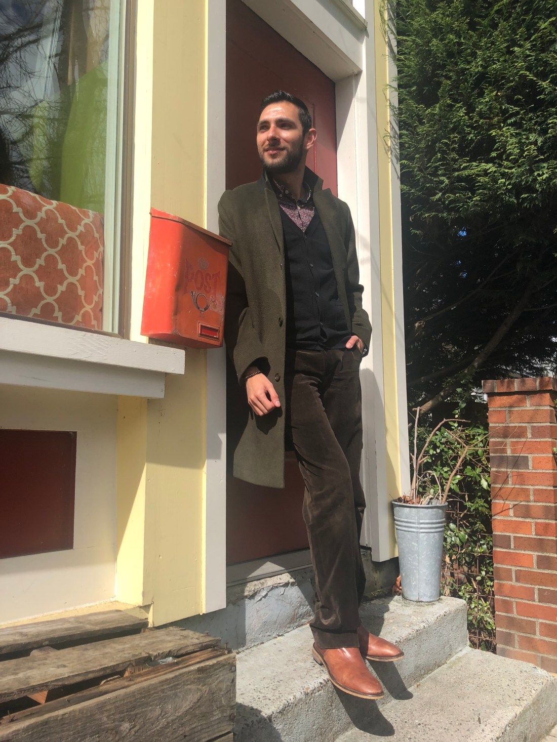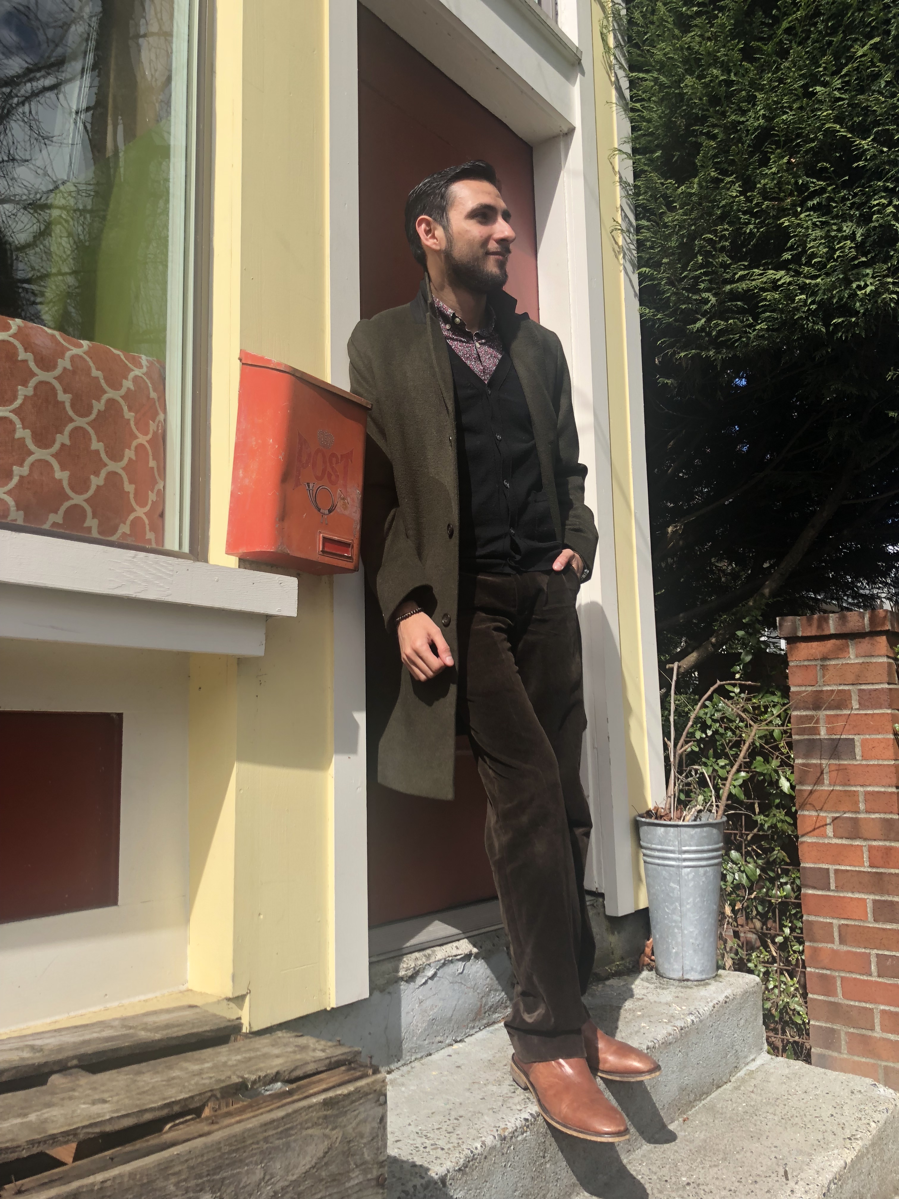 Green overcoat Topman, Floral shirt Club Monaco, Cardigan Club Monaco, Corduroy pants Club Monaco, Chelsea boots Aldo
