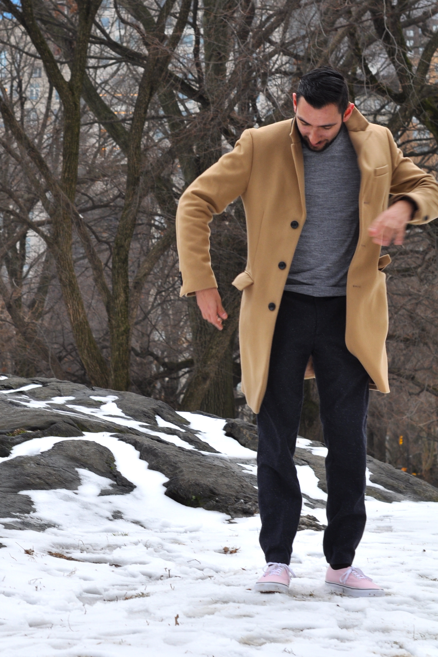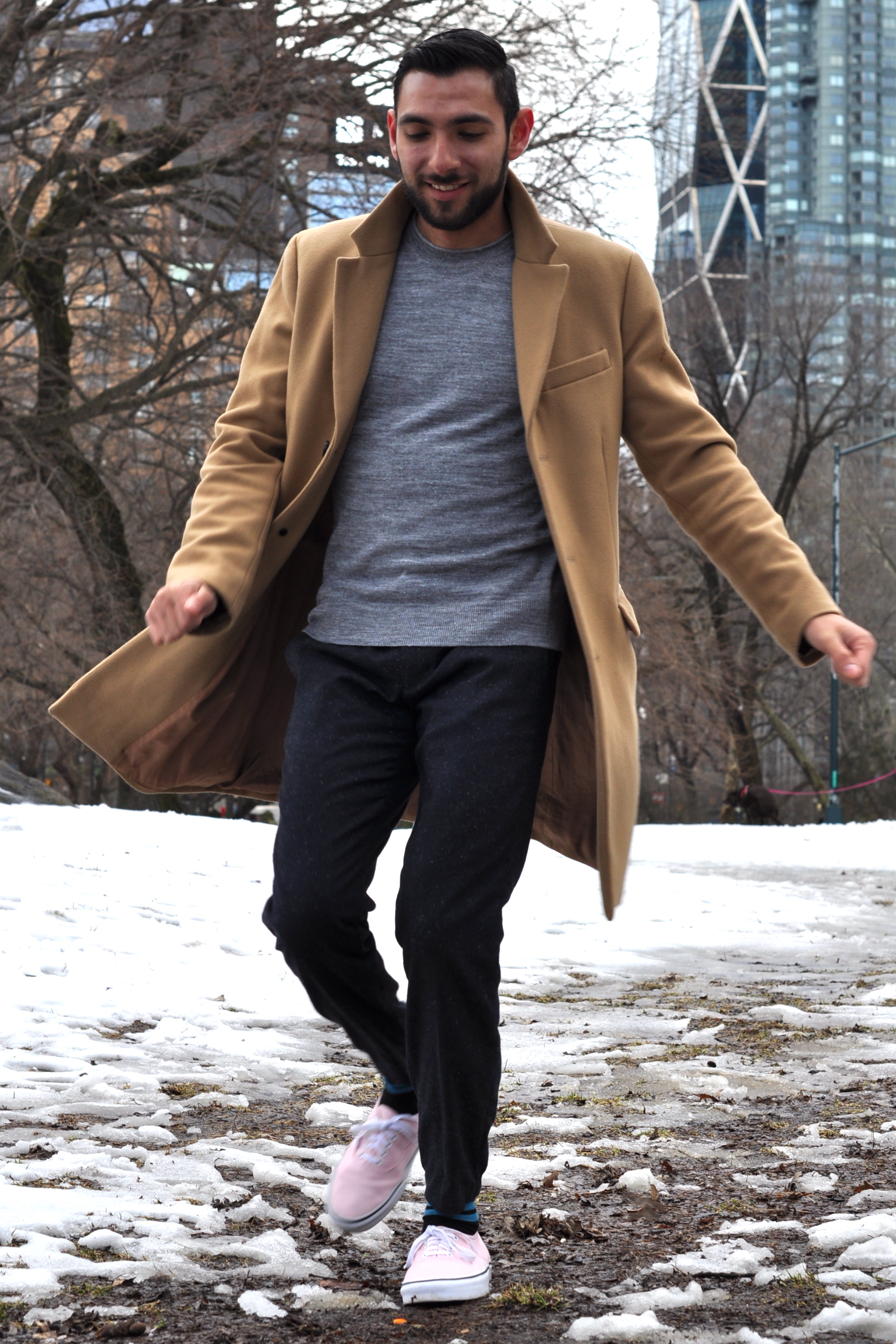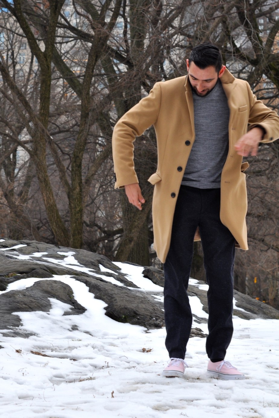 Look 1 – Camel topcoat Club Monaco, Gray rollneck sweater Club Monaco, Black wool pants Club Monaco, Pink sneakers Vans