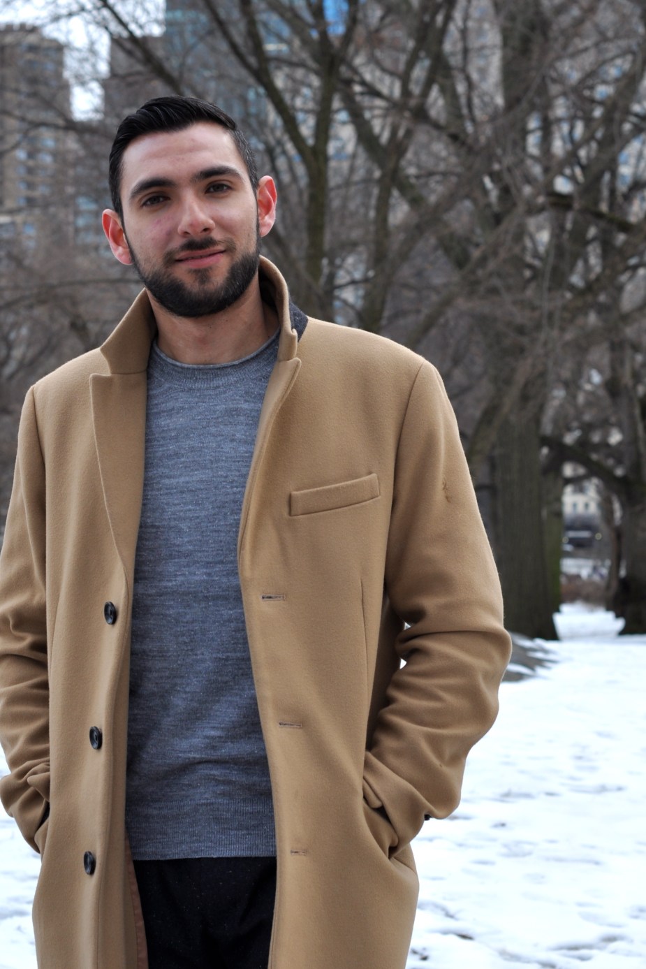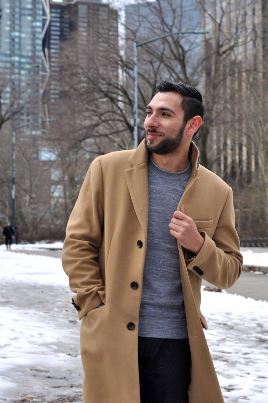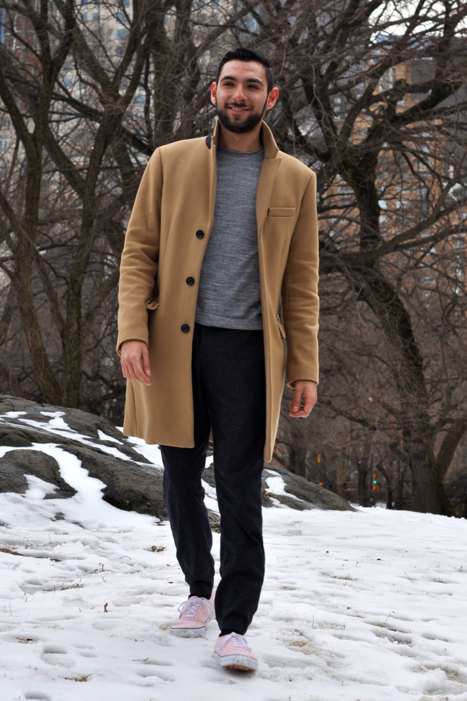 Look 1 – Camel topcoat Club Monaco, Gray rollneck sweater Club Monaco, Black wool pants Club Monaco, Pink sneakers Vans
