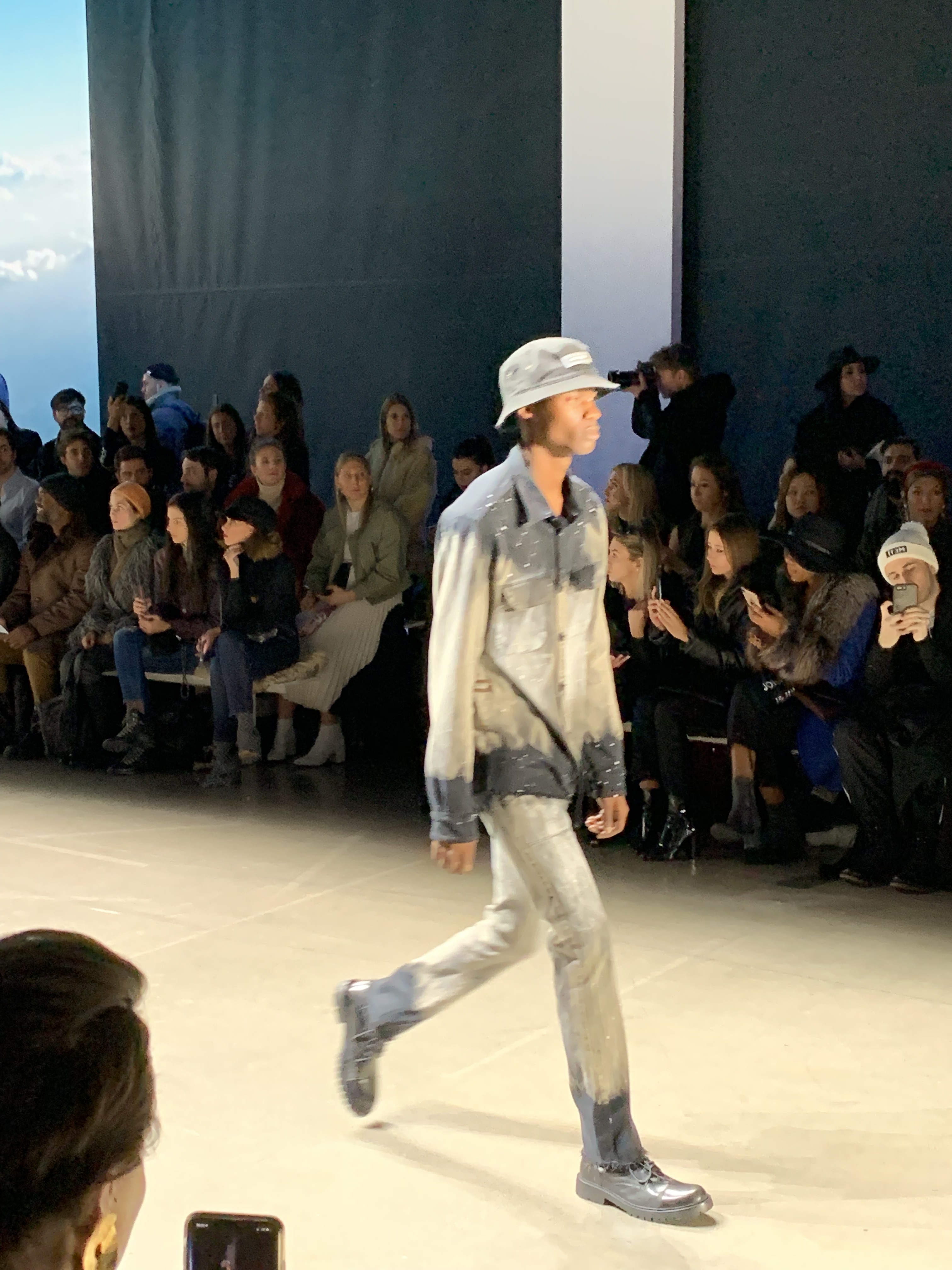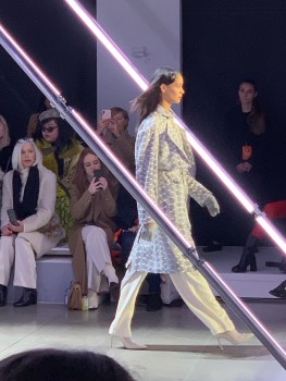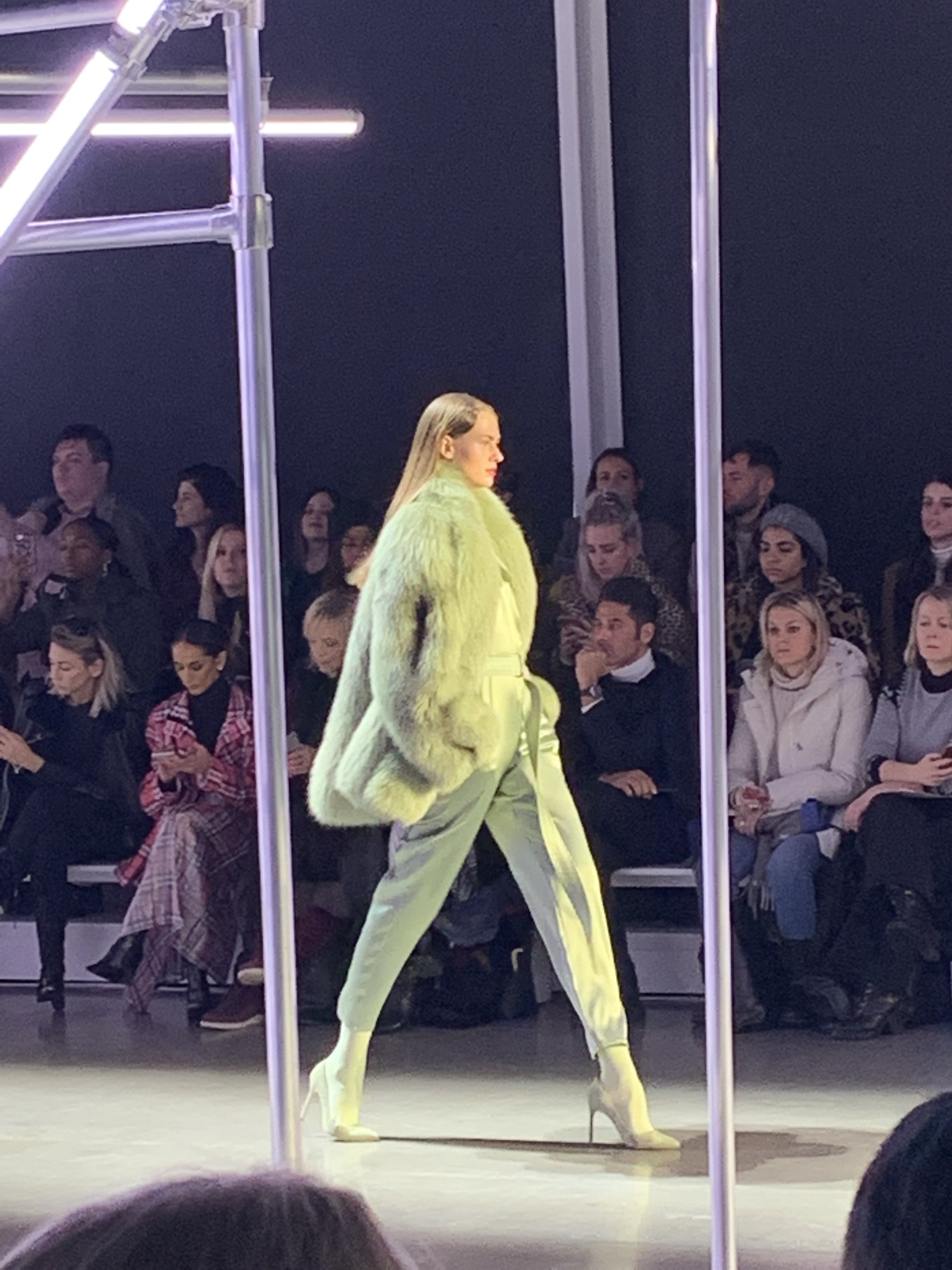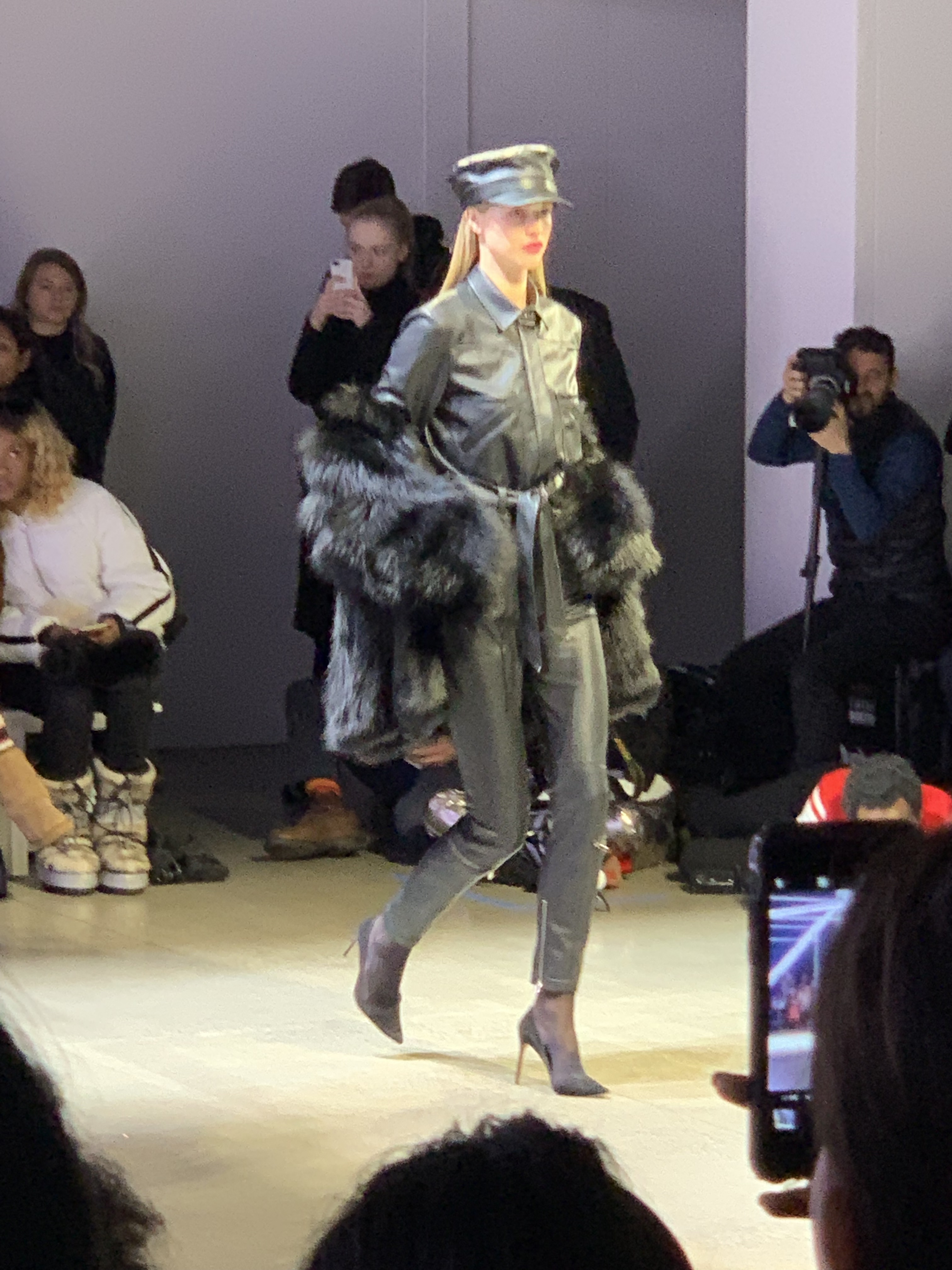 Our first show of the day was Sally Lapointe, a women’s designer of ready-to-wear fashion from New York City. Sally had already been featured at multiple runway shows, and she launched her collection in July last year. She has quickly acquired lots of love from celebrities, having dressed Jennifer Lawrence, Michelle Obama, Emily Blunt, Kendall Jenner, and Gigi Hadid, among others. That’s why when I saw that she was in our lineup, I knew that we were up to a great start to our day. Lapointe’s clothes focus on the everyday woman of today. She uses bold fabrics and statement pieces to make her models stand out from a crowd of people. Something that I really liked about her design aesthetic is how she layers multiple pieces to give the look more dimension. These pieces could easily be interchanged between one another and it would still look great, so there was a whole lot of cohesion and the clothes told the same story. My favorite outfit was a full pants suit in mint green with a fluffy vest and sleek cigarette pants. Overall, the feel I got from this collection is that it is trying to empower the everyday woman to do anything, and it is giving them a platform to express themselves in their most authentic version. I really, really liked many of the pieces in this collection.