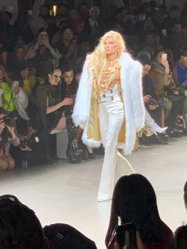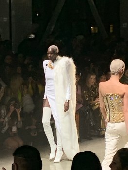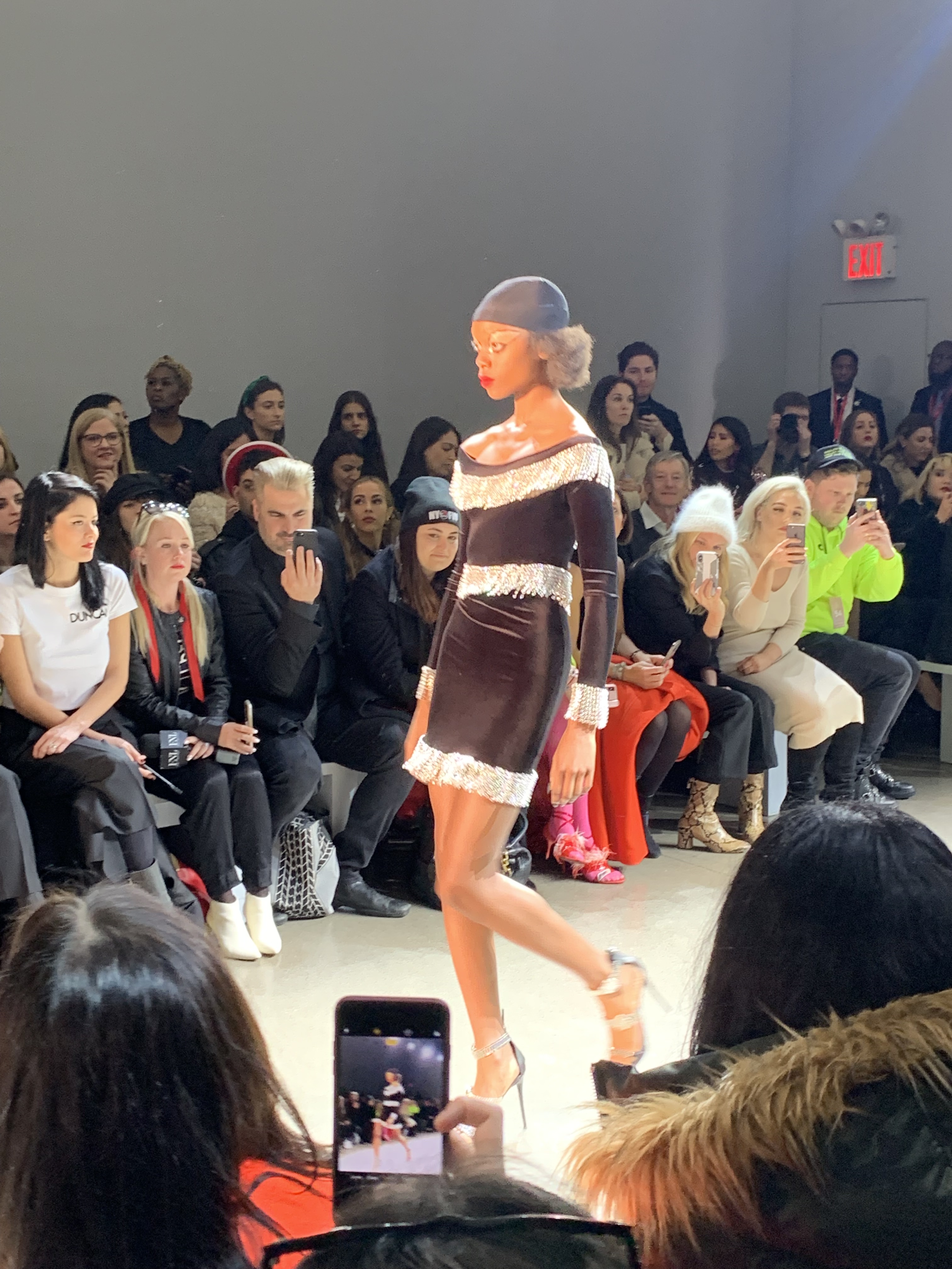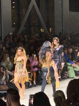 Last but not least, we had our last show of the night by The Blonds. This is a luxury apparel brand based in NYC and co-founded by designers Phillipe and David Blond. They are best known for giving their collections a glamourous, yet rebellious twist, taking inspiration from music, film, and art in general. Their collection utilized an eclectic mix of textiles, such as leather and nylon, and accessories and jewelry that focus on accentuating the human body. This included some gem-encrusted bodysuits, mini dresses and skirts embellished in crystals, and corsets and bodices adorned with spikes, sequins, and even chains. Some of the people that have worn their design include those of the likes of Madonna, Katy Perry, Rihanna, and Jennifer Lopez. I think this was my favorite collection, because even though it was easy to go costume-y, they never crossed that line. All the designs looked polished, elevated, and even expensive in many ways. My favorite was a gold mini dress with fringe and embroidery that was worn by no other than the high fashion model Paris Hilton herself. This show was a complete party and a blast and joy to experience, and it ended with a live performance of rapper Lil Kim. There was not a better way to close the show than with this golden bow! I really want to thank everyone at New York Fashion Week: The Experience for making this another unforgettable, incredible life event and for letting me and my sister witness the very best of fashion from all around the world.