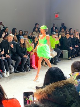 Next in line, we were given the opportunity to see Christian Cowan, an acclaimed young British designer who moved to New York City just two years ago and has already made a name for himself thanks to his signature aesthetic. Christian takes inspiration in his design from music, which means that he wants you to go through a journey when seeing his clothes. He is also of the idea that the real world and the day to day life should be different from creating art, since art should be an escape; he wants to brighten your day with his clothes. I could really sense this feeling of joy and escapism through Christian’s collection. First of all, it featured bold, neon colors in all of the designs, from yellows, to greens, to fuchsias, the whole collection was a rainbow of neon colors. Then we have the hats, which were featured in each of the look. These hats gave it cohesion, but also another fun element to look at. My favorite look was a bright yellow shirt that then turned into a dress. I think that it’s great when designers think outside the box and give us something fresh and unexpected, similar to Jeremy Scott’s space collection last year. I had a lot of fun watching this collection, and the cherry on top of the cake was that I was able to meet Milk and Aquaria, two drag queens from RuPaul’s Drag Race, that were seating just across from us next to the runway.