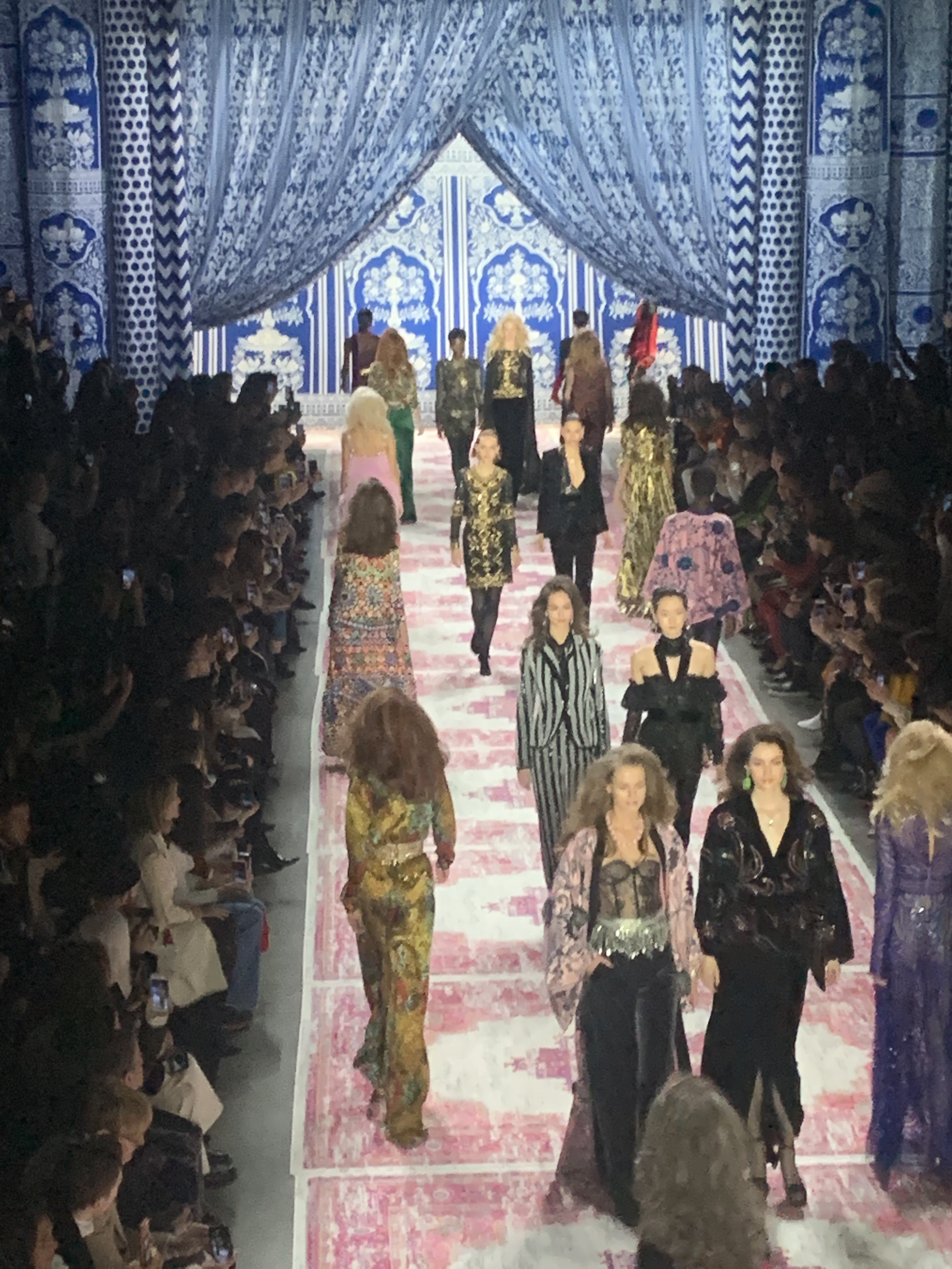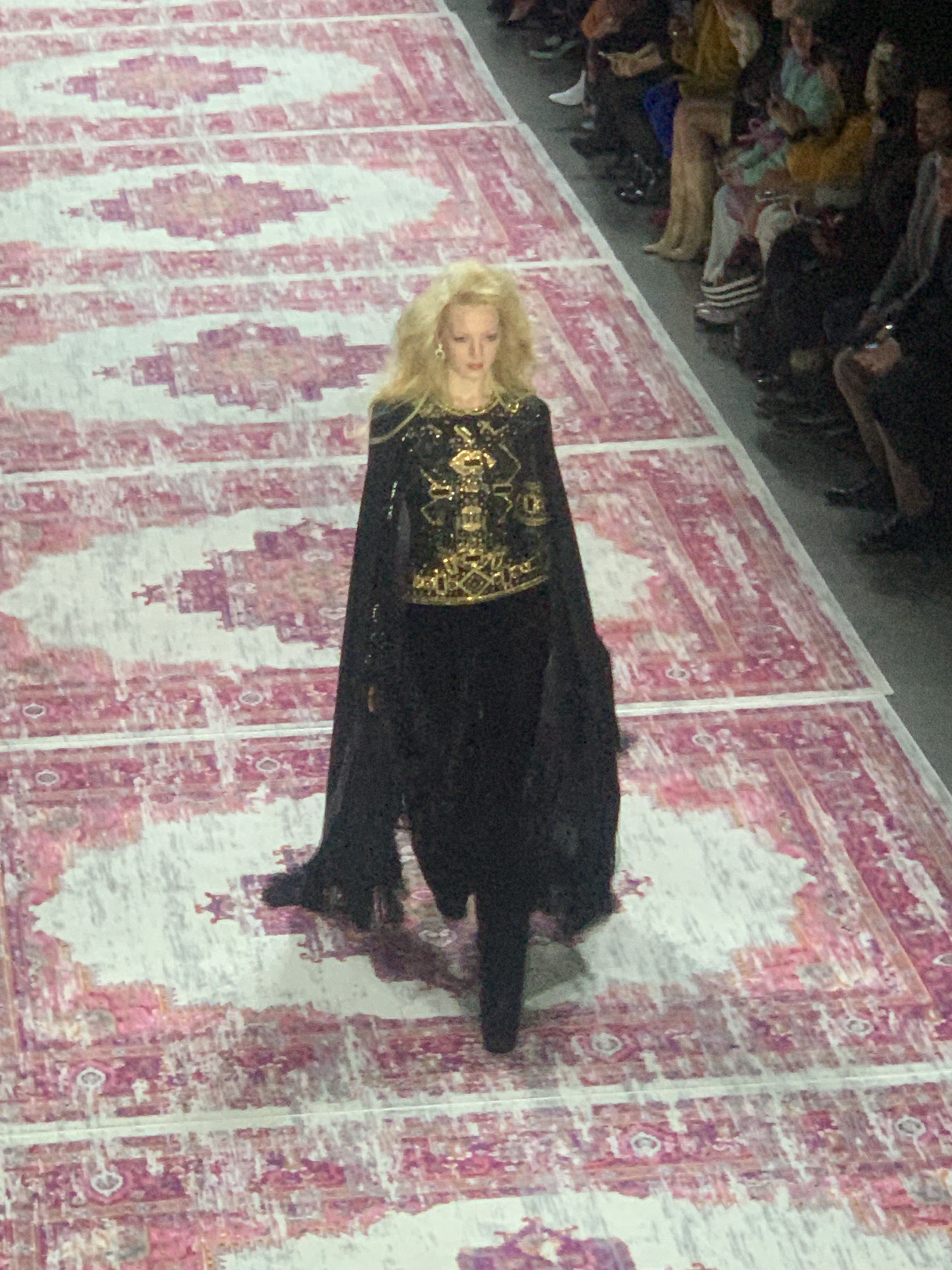 The following collection that we had the privilege to see was Naeem Khan’s. Khan is one of the biggest names in fashion; some of his fans include Beyoncé, Penelope Cruz, Jennifer Lopez, and Queen Noor of Jordan, and his designs have been featured on movies such as Sex and the City and Dreamgirls. His luxurious homonymous line Naeem Khan consists of sophisticated gowns and impeccably crafted dresses, all embroidered by hand. Khan was born in India, and surrounded by such a colorful, beautiful culture he brought back some of that mysticism and intricate design from royal families in Southeast Asia to the rest of the Western World. One thing that quickly struck me about this collection is that it is considered modest fashion, which means that the models are almost fully covered. This idea comes from certain religions and cultures in the Middle East and in India that say that women should not be allowed to show their skin when wearing clothes. What at first might sound as a hindrance to design, becomes actually a quality, since most of these designs actually end up looking really luxurious and for a more sophisticated audience. My favorite look was a black and gold floor gown with embroidered gold sleeves and a structured, laced bodice. The whole collection was really impressive, and the background and props completely transported us to another place in another time. All and all, it was a timeless collection that I could see in the frontlines of Bergdorf Goodman or Neiman Marcus in the following years.