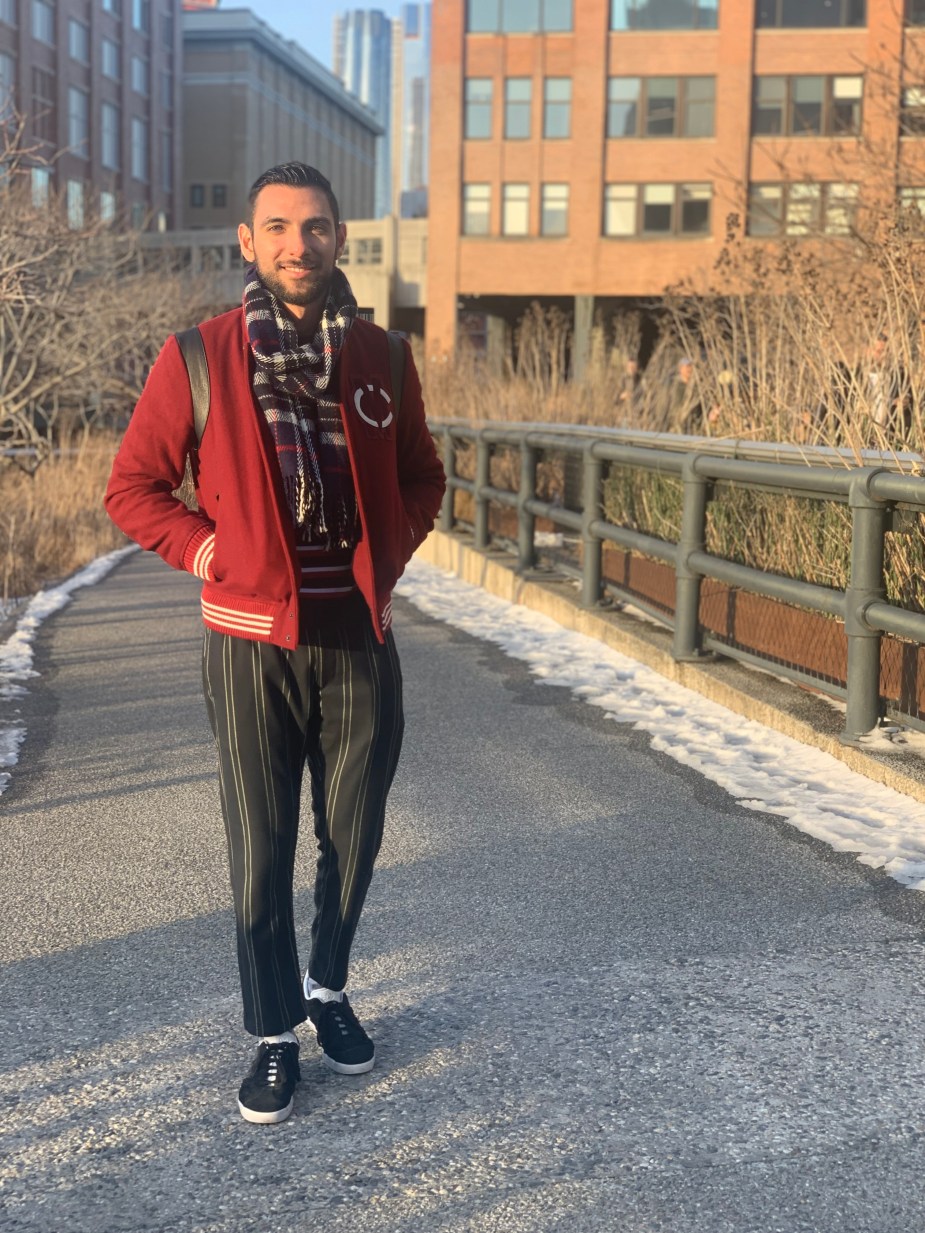 For the next look, I wanted to mix different prints and patterns, so I went all-in with three different patterns. The first pattern is a red, black, and white horizontally-striped sweater from Topman. This sweater is the same that I wore to The Shows, but this time I wanted to give it a different vibe so I paired it with some vertical striped chino joggers from Topman. Finally, the third pattern is a tartan blue, red, and white scarf from Club Monaco, and I wore a red varsity jacket with a C on it, also from Club Monaco. Something that I really liked about this look is how, even though the patterns are all different, there is a color symphony that I was going for with the blues, reds, blacks, and whites in different arrangements. This gave the outfit cohesion, and also helped pull everything together. I wore this outfit to the Whitney Museum of American Art, where we were able to see the largest Andy Warhol art collection in the United States. This was a great opportunity to visit a museum that I hadn’t been to, and after the visit, we were right outside the famous High Line park in the Chelsea neighborhood. This park was built on top of an abandoned street and train tracks, and it offers some amazing views of the Hudson Bay and the Meatpacking District.