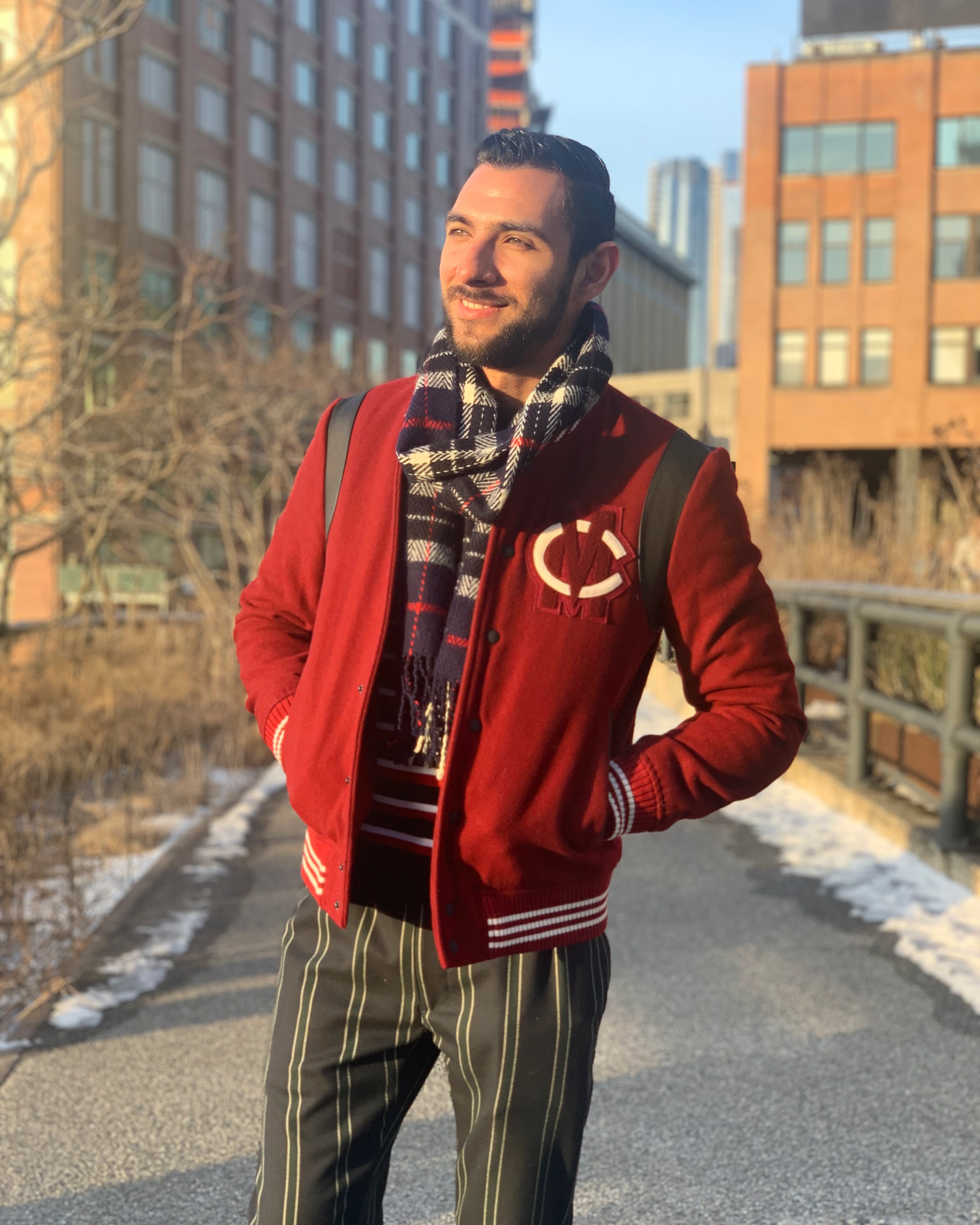 Para el siguiente atuendo, quería mezclar distintos patrones y estampados, así que me fui all-in con tres patrones distintos. El primer patrón es un suéter de rayas horizontales en colores rojo, blanco y negro de Topman. Este suéter es el mismo que me puse para The Shows, pero esta vez quería darle un uso distinto así que lo conjunté con unos joggers tipo chinos con rayas verticales también de Topman. Finalmente, el tercer patrón es un tartán en color azul, rojo y blanco de una bufanda de Club Mónaco y, sobre estos me puse una chamarra de universitario en color rojo con una C grande, también de Club Mónaco. Algo que realmente me gustó de este look es que, aunque todos los patrones son diferentes, hay una sinfonía en los colores gracias al azul, el rojo, el blanco y el negro en los diferentes arreglos. Esto le dio al outfit cohesión y ayudó a que todo tuviera un hilo conductual. Me puse este atuendo para asistir al Whitney Museum of American Art, lugar donde vimos la colección más grande de arte de Andy Warhol en los Estados Unidos. Esta fue una excelente oportunidad para visitar un museo al que nunca había ido anteriormente y, tras la visita, nos encontrábamos justo afuera de donde comenzaba el parque High Line en el vecindario de Chelsea. Este parque fue construido sobre una calle y vías del metro abandonadas y ofrece unas de las mejores vistas de la bahía del Hudson y del Meatpacking District.