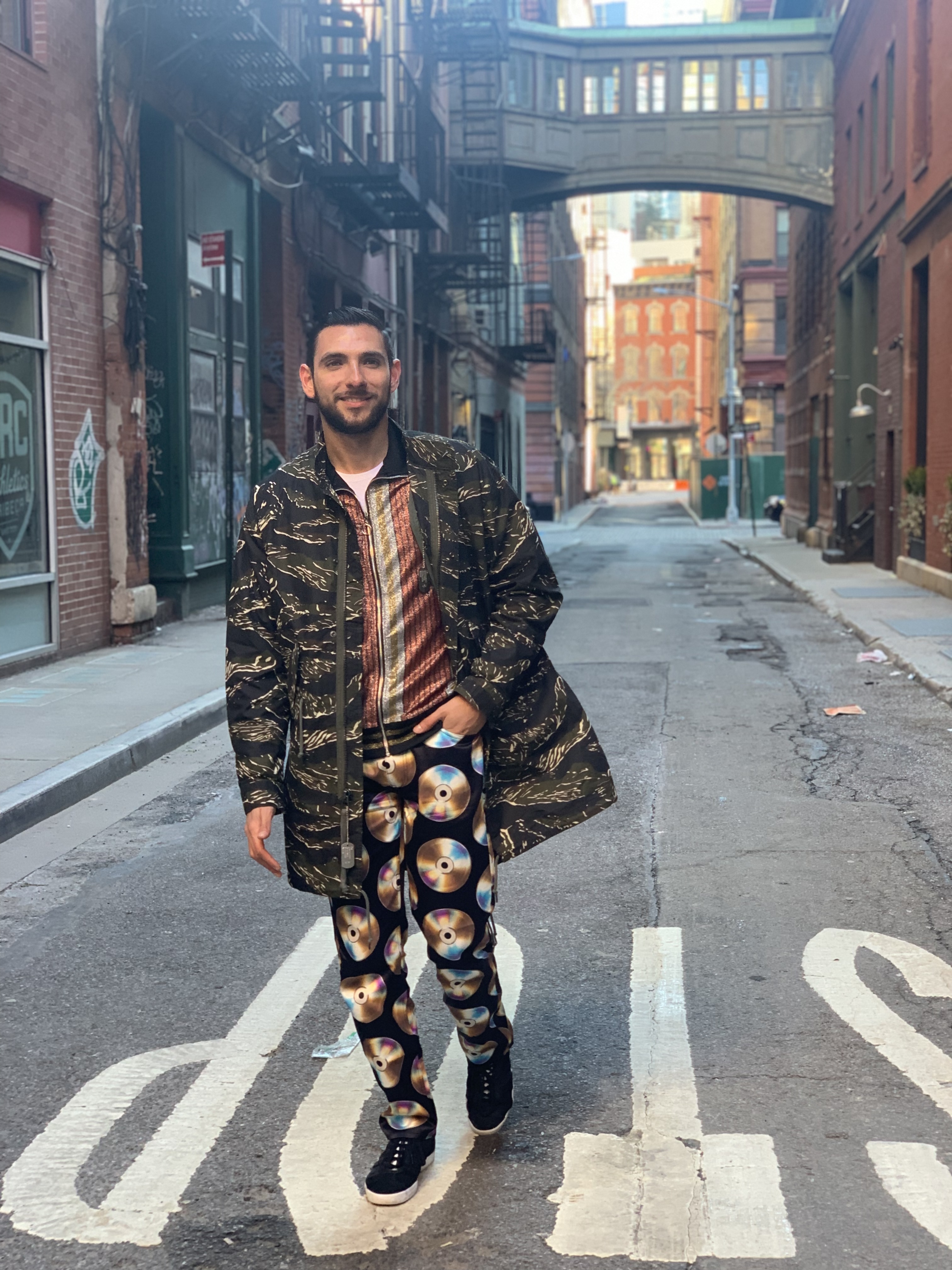 Finally, we have the last day look, which is inspired by consumer culture and the post-World War 2 era. This look is a little bit more “out there” than what I usually wear, but I wanted to do a street fashion look that would have a little backstory and also have a little fun with the outfit. Here I’m wearing a pair of pants from the Jeremy Scott H&M collaboration which features a bunch of CDs and a bright disco jacket from Topman. The idea here was to represent the Disco era of the 1970s, but bringing it to the 1990s with the CDs and the athletic type of clothing, since the 90s are really popular nowadays. Then the military jacket, which is from Barneys NYC, is an ode to that Yves Saint Laurent collection from the 1970s, but also brought to the present with a little twist from the green leaves and olive tones, which helps bring the whole look to a different level. Finally for the shoe I just wore my Adidas black suede sneakers, to complete the athletic vibe. What do you folks think? Which one of the four looks was your favorite? I once again want to thank my sister for taking these pictures in the beautiful Tribeca neighborhood, in one of the most well-known, most photographed streets of NYC, Staple Street.