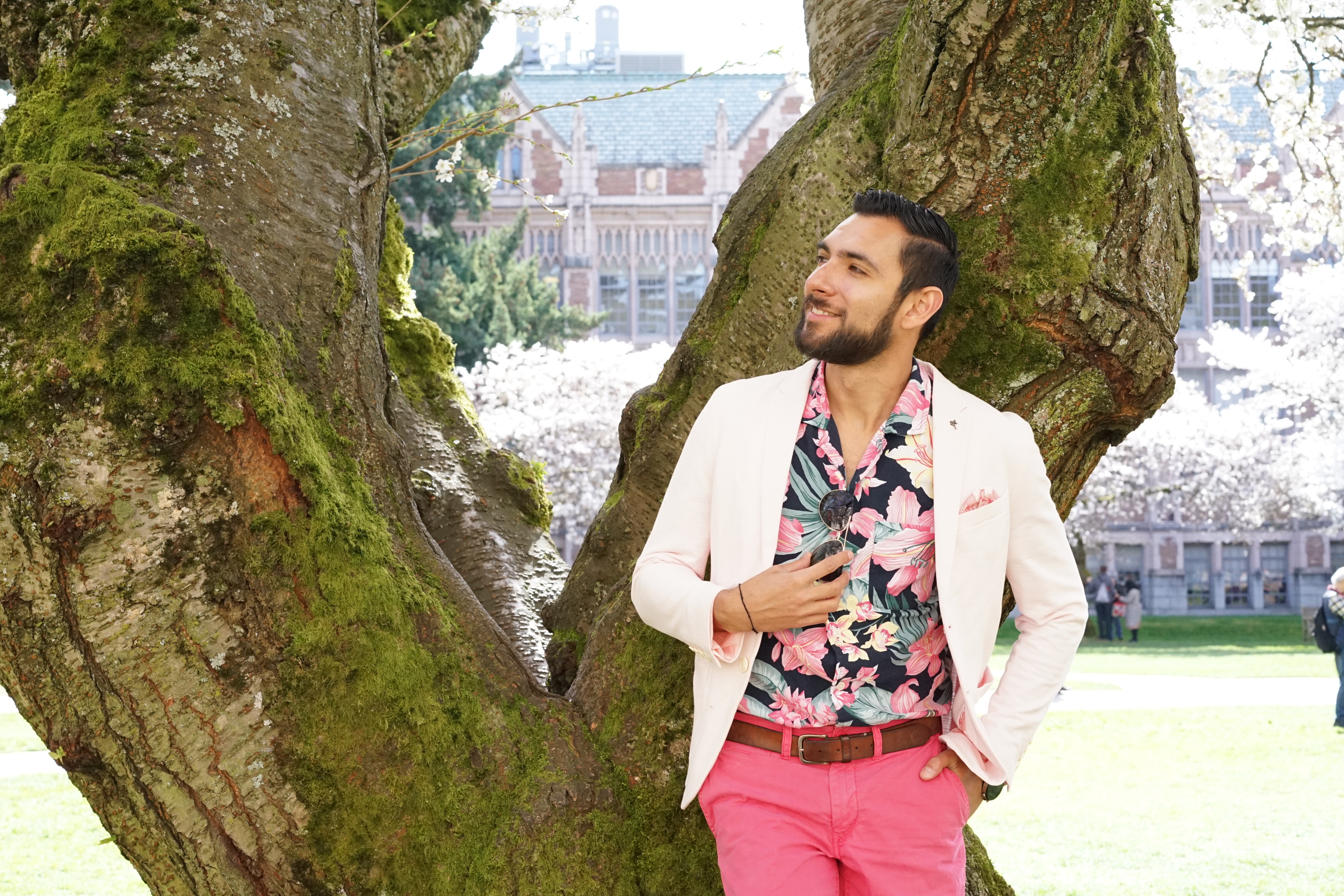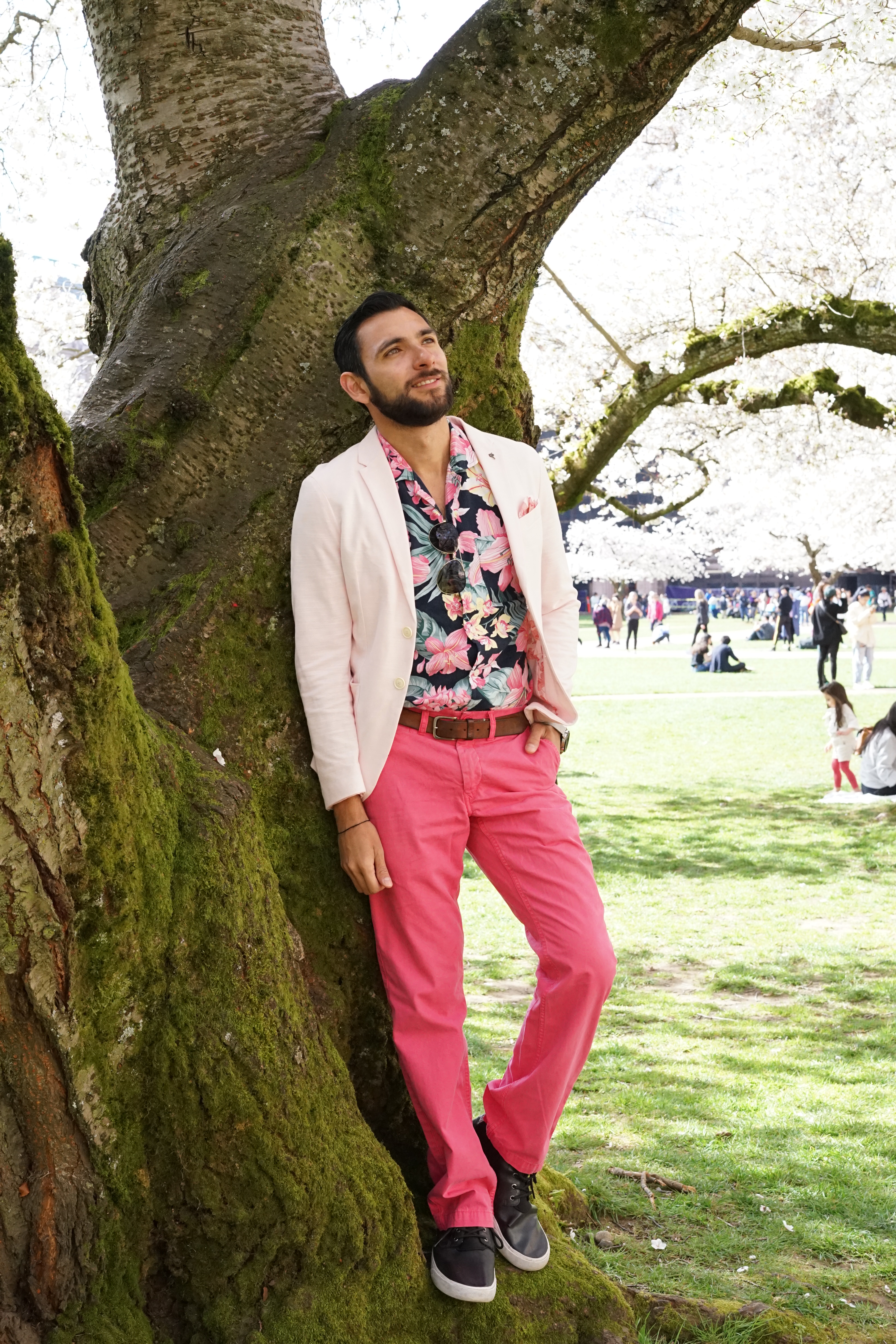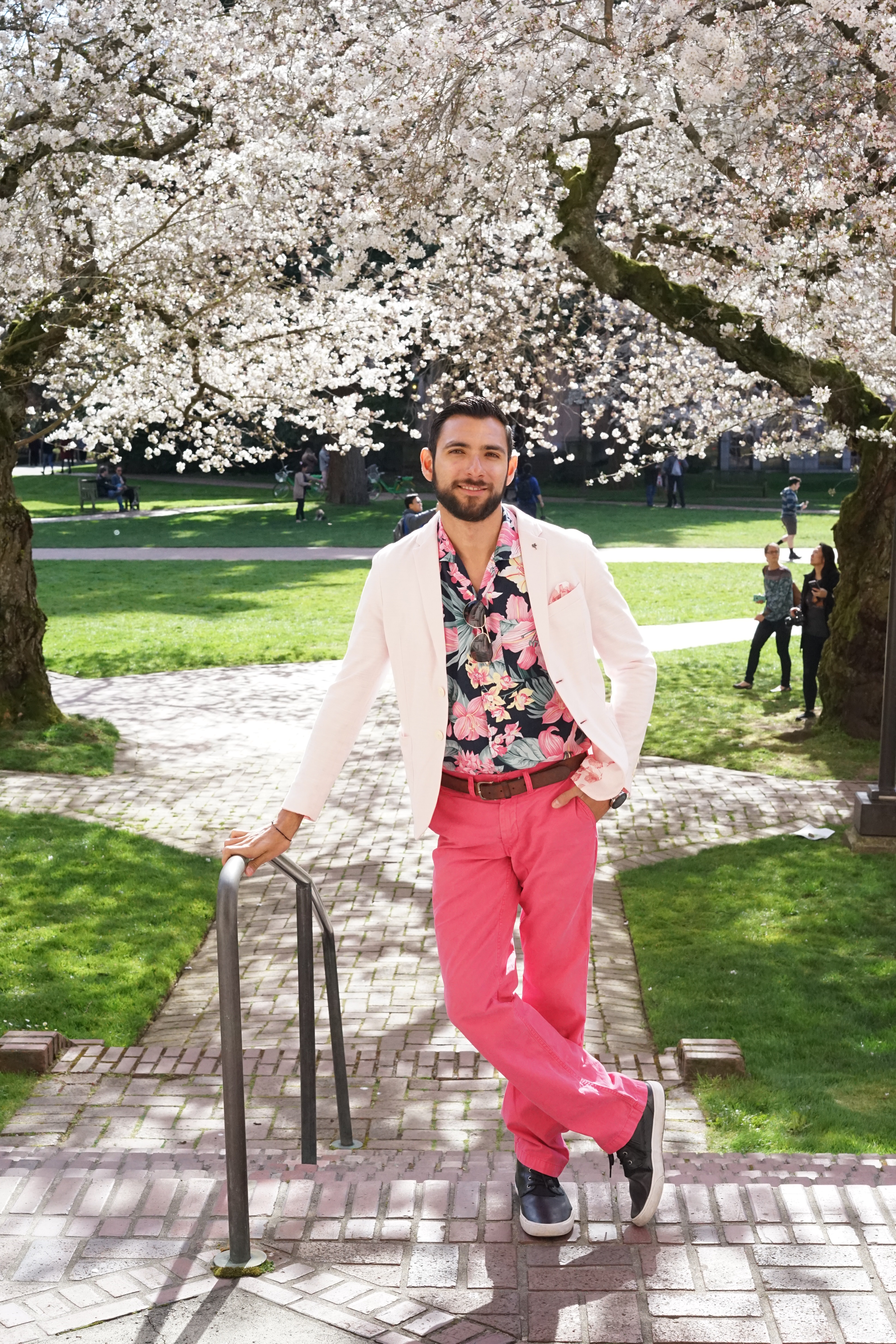 For my stroll with Kim under pink cherry blossom backgrounds I decided that I was going to try and match the surroundings. I opted for a very light pink blazer from Zara along with a floral button-up from Abercrombie and Fitch. For the pants, I went for a bright, hot pink pair of chinos from Bonobos and I tied everything together with some sunglasses from Ted Baker. Finally, for the shoes I wore my water-proof chukka boots from Sperry Topsider. Both Kim and I enjoyed a not-so-busy in-between class periods moment and that’s when we took most of the pictures. So, what do you guys think? Does your city have cherry blossoms? I want to thank Kim for these gorgeous shots and for taking the time to do this shoot with me. I love you boo!