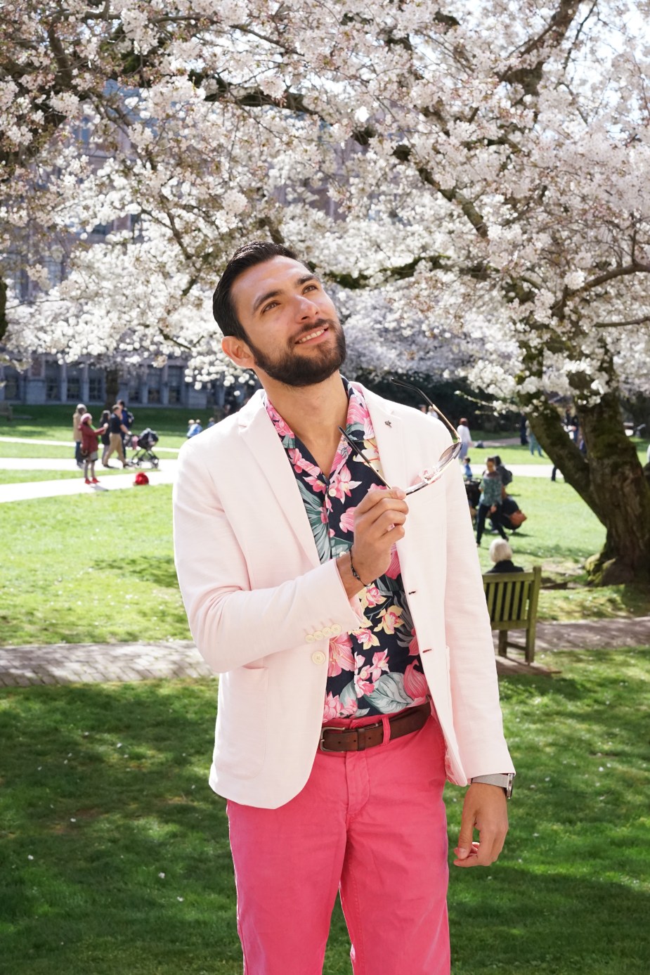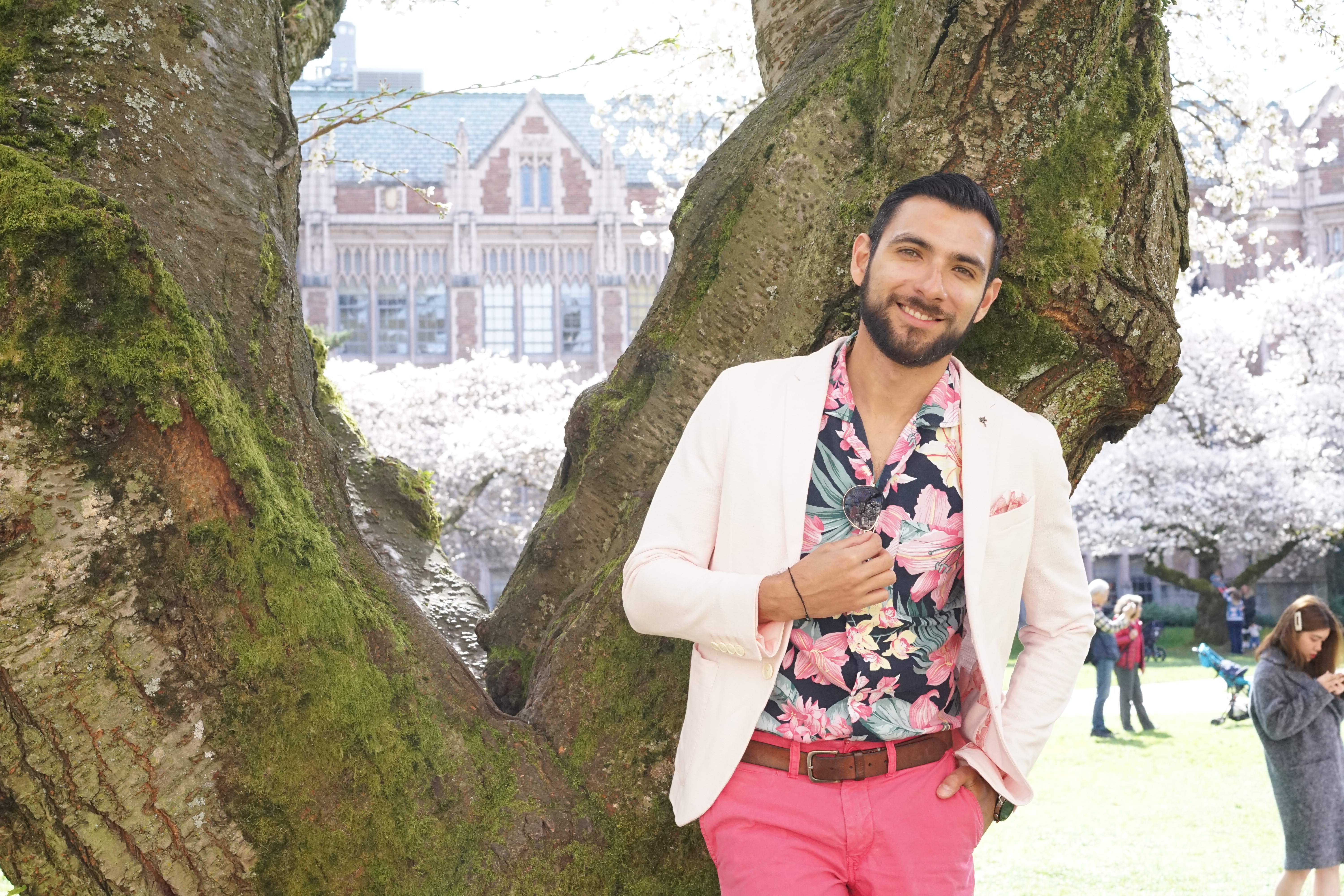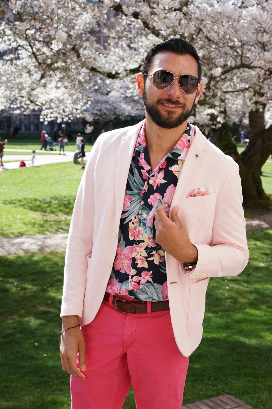 For my stroll with Kim under pink cherry blossom backgrounds I decided that I was going to try and match the surroundings. I opted for a very light pink blazer from Zara along with a floral button-up from Abercrombie and Fitch. For the pants, I went for a bright, hot pink pair of chinos from Bonobos and I tied everything together with some sunglasses from Ted Baker. Finally, for the shoes I wore my water-proof chukka boots from Sperry Topsider. Both Kim and I enjoyed a not-so-busy in-between class periods moment and that’s when we took most of the pictures. So, what do you guys think? Does your city have cherry blossoms? I want to thank Kim for these gorgeous shots and for taking the time to do this shoot with me. I love you boo!