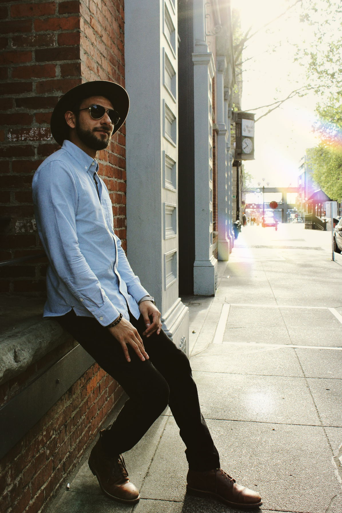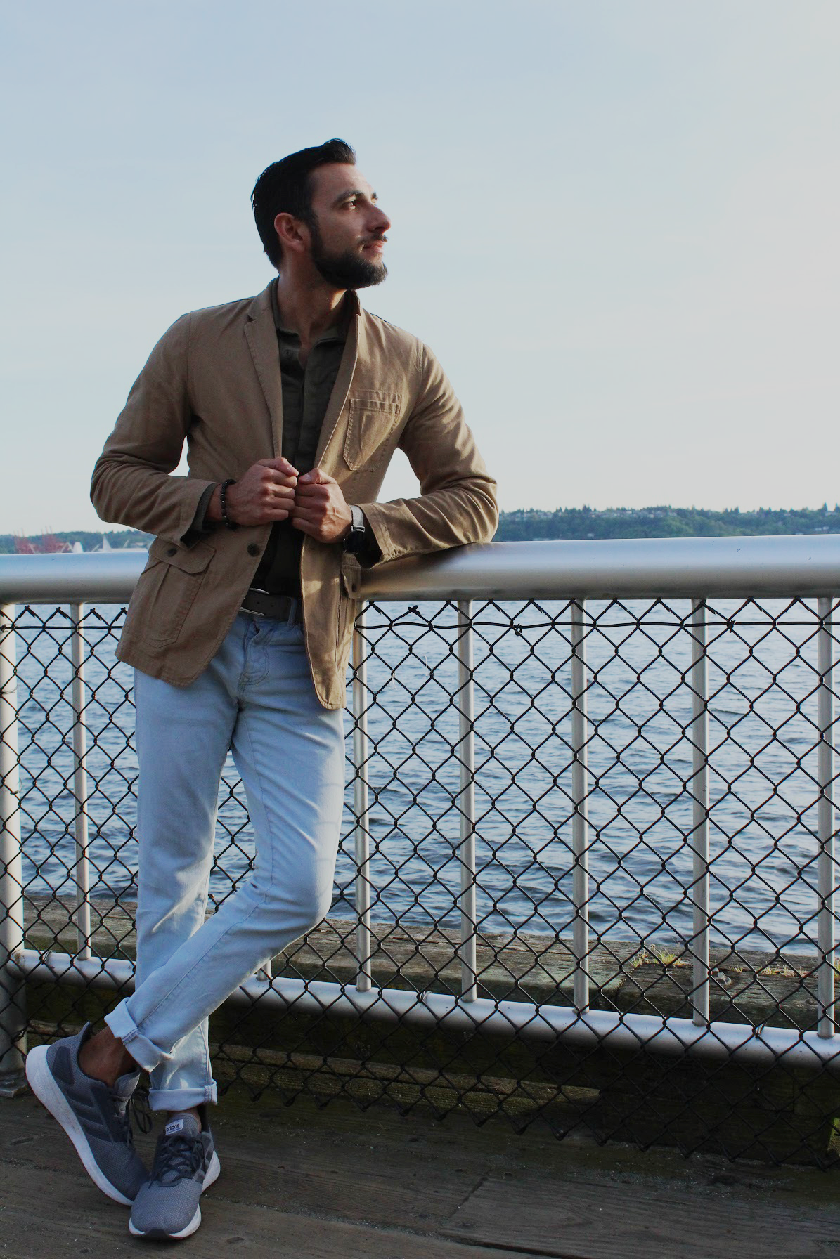 To honor the great Upper Left coast I wanted to represent both the American West and a more urban, city vibe with the following two looks. On the first look, you can see me wearing a soft blue. chambray shirt from Club Monaco along with some black jeans from Topman. My brown leather boots are from J. Crew, and for the accessories, I’m wearing my Brixton hat with a pair of Ted Baker sunglasses. My second outfit comprises a tan sports jacket from Club Monaco, along with a military green shirt from Topman and a pair of washed jeans from that same shop. My shoe is an Adidas pair of gray sneakers, and for the accessories, a gray leather belt from Club Monaco and my Skagen smartwatch. What do you all think? I want to give a huge shout out to Blake for photographing this shoot. He has a great eye for scouting out the best locations and he also made me look like a million bucks in these two outfits. There is such great photography talent in Seattle, and Blake’s among the best ones!