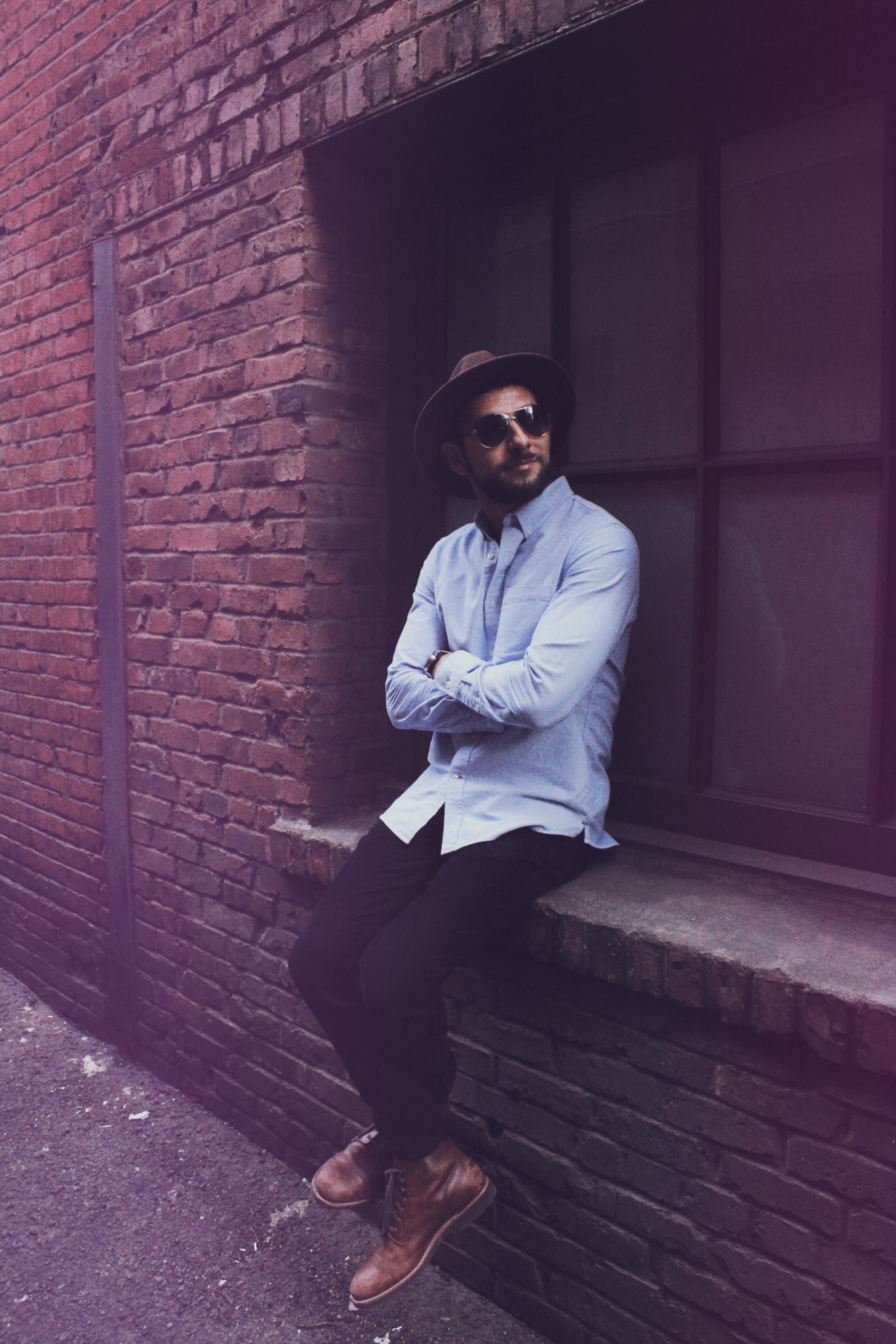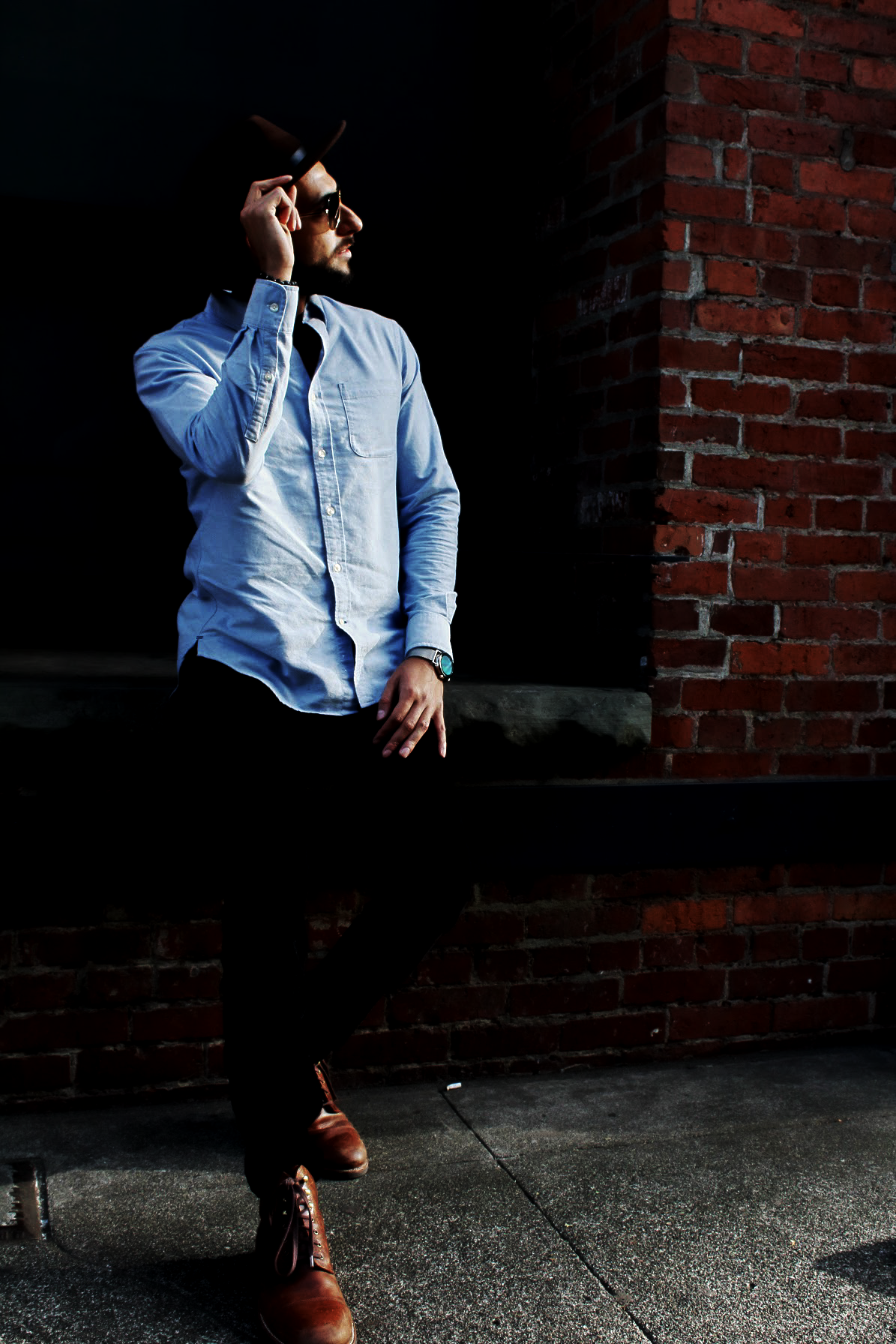 Look 1 – Soft blue chambray shirt Club Monaco, Black jeans Topman, Brown leather boots J. Crew, Hat Brixton, Shades Ted Baker