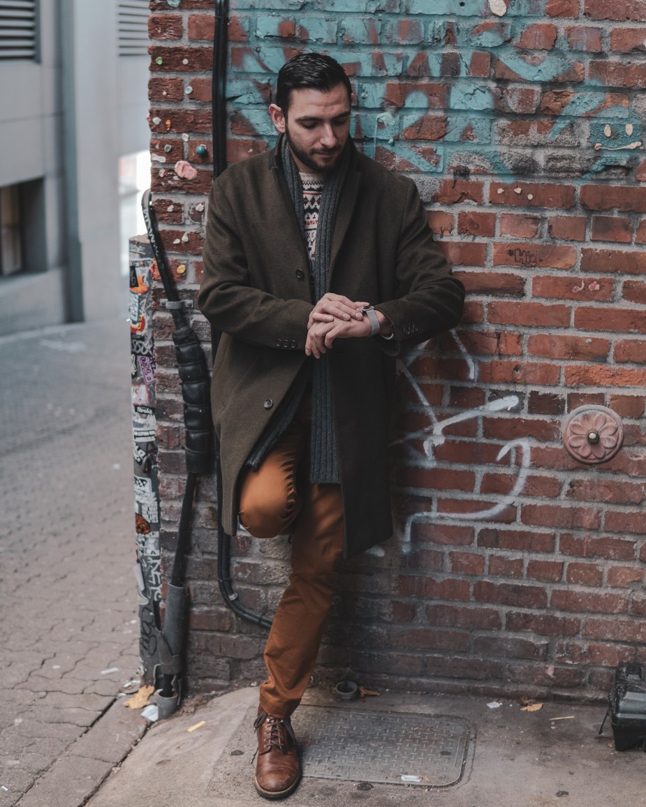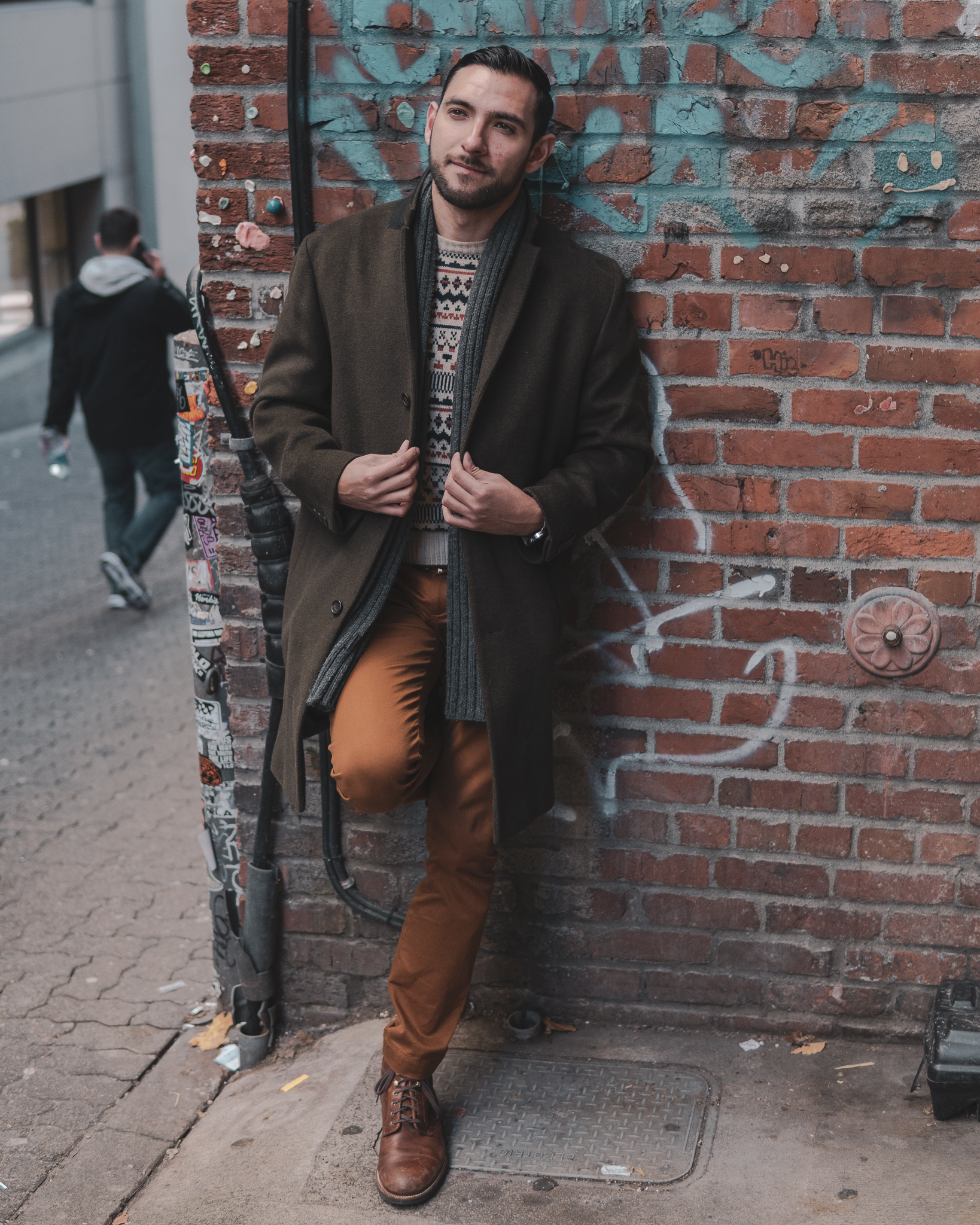 On this occasion, I wanted to bring in layers and patterns that might not be the most typical of winter, but that could still work out especially in the transition to colder weather. That’s why I decided to wear a Fair Isle sweater from Pull and Bear along with a pair of tan chinos from Club Monaco. For the accessories, I opted for a light gray scarf from H&M and the big, green overcoat is from Topman. Finally I wore my J. Crew brown leather boots to complete the whole look. Something that I really like about this look is that it is extremeley versatile, one can easily change the sweater for a cardigan, or the chinos for some fitted jeans, or even the overcoat, and it would still work well for this period in-between seasons. What do you think? See something else from these excellent Gents outfits that you like? I want to give a special shout out to my friend Rashad from MrRLittle for taking these photos in the picturesque, super-urban Pike Place Market in Seattle.